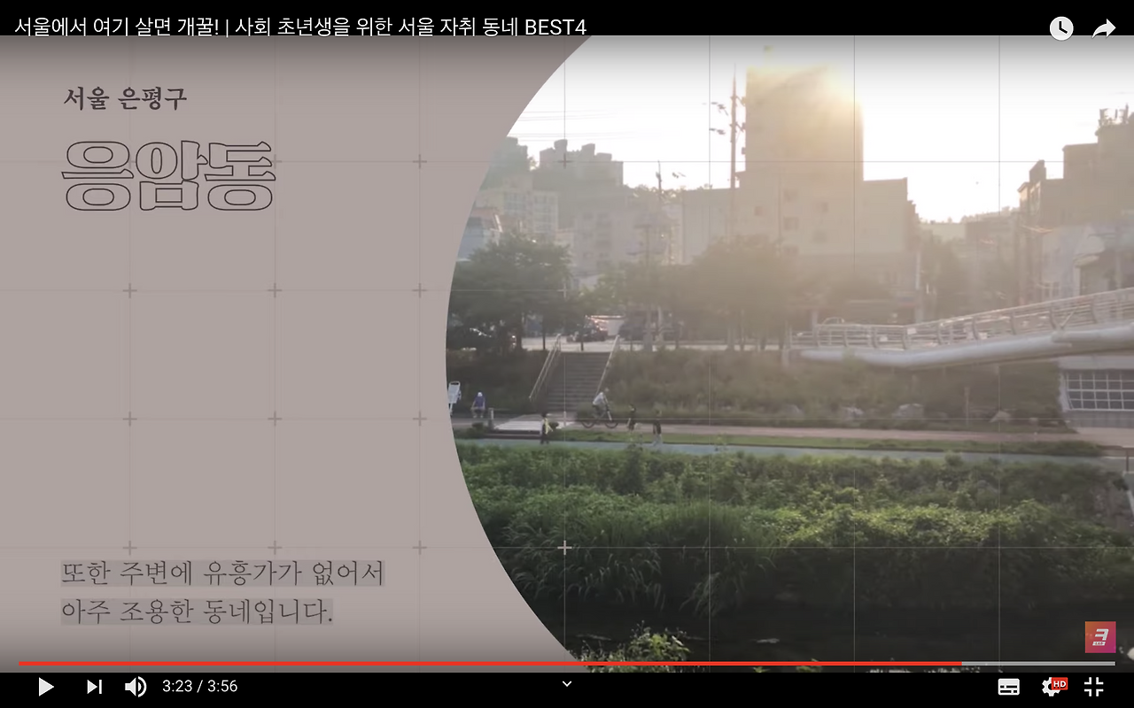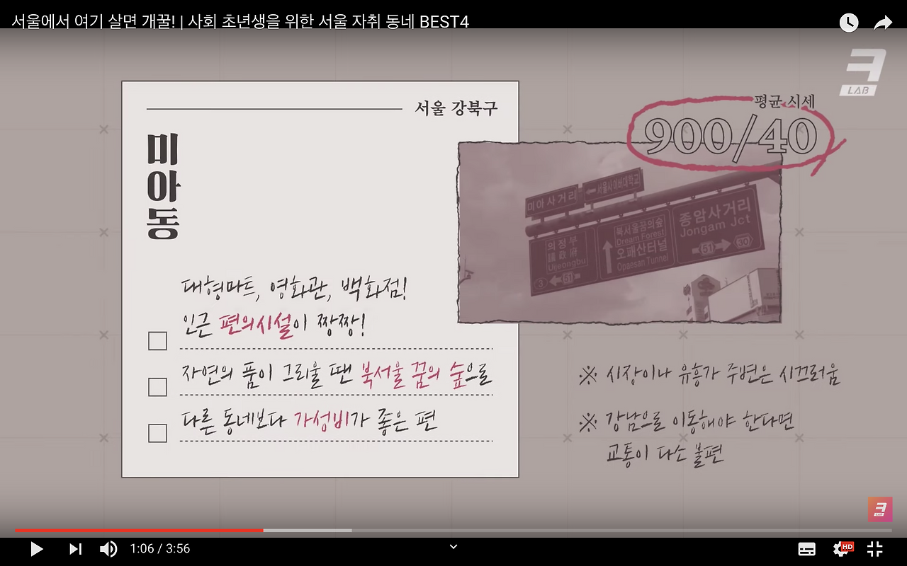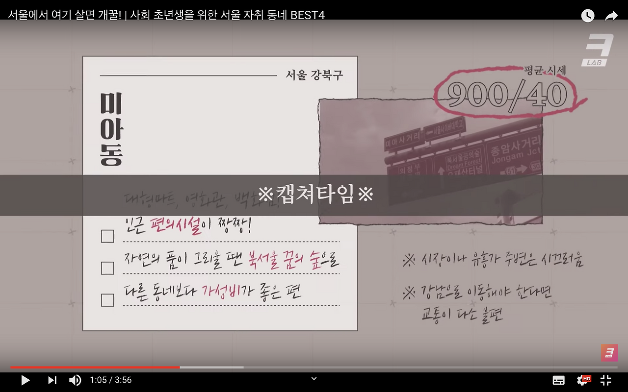 이 의심이 사라지지 않아서 궁리하다가 <캡쳐타임>이란 꼭지를 만들어서 방금 소개한 동네의 장단점을 정리한 화면을 4초 정도 삽입했다. 그리고 그 화면들이 나오는 부분은 타임코드를 찍어서 댓글에 달아뒀다. 이런 장치가 이 콘텐츠는 진짜 너한테 도움되고 싶어서 만든거야~ 하는 느낌도 덤으로 주지 않을까 싶었다.