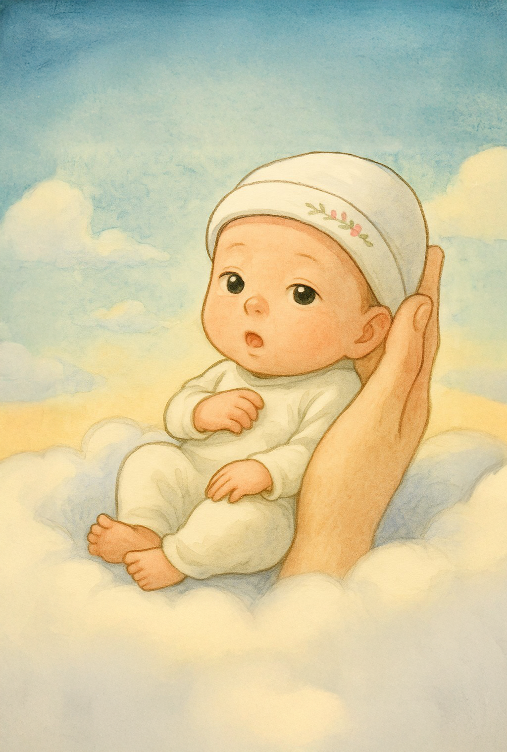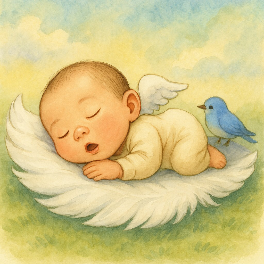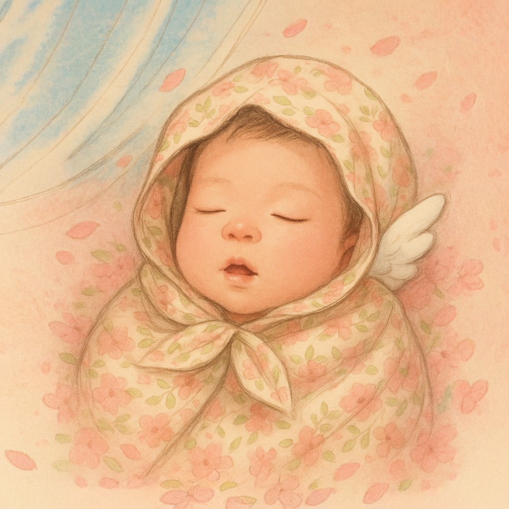 연분홍 꽃잎 속에 감싸인 아기 천사—
