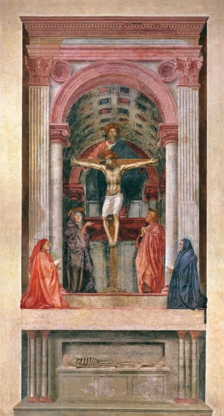 마사초 <성 삼위일체> (1425-1428, 습식 프레스코화>십자가에 못 막힌 사람이 그림 한가운데 있습니다.