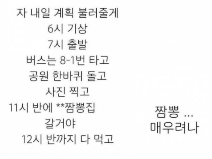 너 T야?라는 밈이 돌 정도로 최근 몇 년간 MBTI는 사람의 성향을 파악하거나 스스로를 드러내기에 적절한 도구로 작용된 것 같다. 그중에서도 가장 대표적인 성향파악 요소는 T와 F, J와 P의 대조이지 않을까. 이런 성향의 차이는 이번 제주여행을 준비하는 과정에서 비로소 절실히 실감할 수 있었는데, 인터넷 포털 사이트에서 쉽게 찾아볼 수 있는 이 짤처럼 P의 성향인 신랑과 J 성향인 나는 ‘여행준비’ 개념부터 천지차이였던 것.