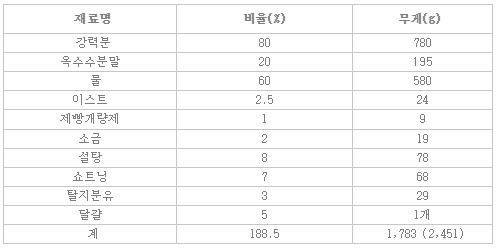 * 학원에서는 옥수수분말 194g / 이스트 34g / 재빵개량제 34g / 소금 18g / 탈지분유 28g 으로 진행.