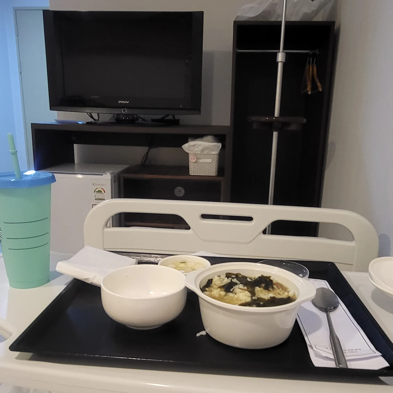 10시 30분경 모든 처치가 끝나고 나니 속이 메슥거렸다. 남편한테 토할 것 같다고 하니, 간호사 선생님이 봉투를 주셨고 먹은 것도 별로 없는데 모두 게어냈다. 오랜 시간 동안 뭘 먹지도 못하고 힘들어서 종종 토하는 산모도 있다고 했다. 11시쯤 입원실로 이동ㅡ간호사 선생님이 병원 침대 채로 이동시켜 준다ㅡ했고 나는 자연분만이라 밥을 먹을 수 있었다.