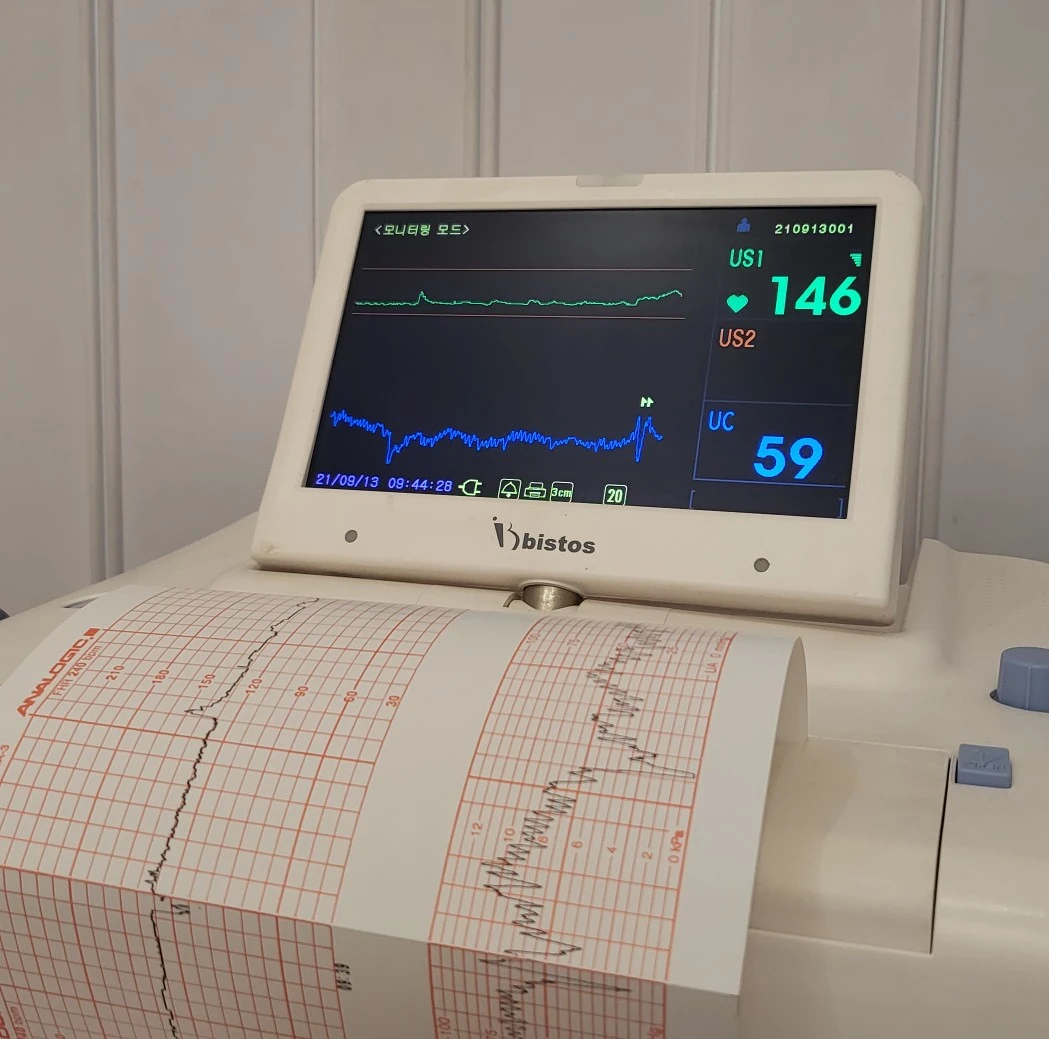 배에 태동검사할 때 착용하는 기계를 다는데, 수축을 표시하는 기계에 숫자 60(UC)이 넘으면 몸이 비틀리는 고통이 찾아온다. UC는 수축 수치인데 90 넘는 고점을 찍고 나서 숫자가 훅- 떨어지면 언제 그랬냐는 듯 생리통 정도의 아픔만 남는다. 의학이 발달했는데 참을쏘냐, 3시 10분경 2차 무통주사 그리고 4시 45분경 3차 무통주사를 맞았다. 나는 더운지 땀을 많이 흘렸고, 어지럽고 속이 메슥거린다고 남편에게 말했다고 한다. 기억이 없다. 무통주사는 1시간인가, 1시간 10분 간격으로 맞을 수 있으므로 나는 대충 눈에 보이는 몇 분을 참고 바로 무통주사를 외치는 편이었다. 고통 시름.