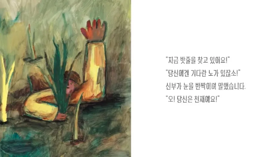《노를 든 신부》는 유튜브로도 제공되고 E-book도 있다. 중학생 이상의 친구들과 수업을 하게 되면 꼭 《노를 든 신부》를 해보고 싶다. 특히, 어른들과도. ‘노’를 활용해 사람을 구하는 장면 뒷부분을 상상해서 이야기를 지어내기도 하고, 각자의 ‘노’가 무엇인지 고민하게 하고 싶고, 우리가 살아가면서 굳이?라고 생각했지만 안 하면 안 될 것 같은 관습이 무엇이 있는지도 이야기 나눠보고 싶다. 대화를 나눌 ‘거리’가 많은 그림책이다. 어쩌면 이 그림책이 부모와 자식 간의 세대를 이해할 수 있는 길잡이가 될지도 모르겠다.