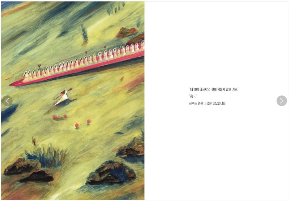 《노를 든 신부》 그림책을 읽고 너무 좋았는데 왜 그랬나, 생각해 보면 나는 참 관습을 벗어난 채로 살아왔던 것 같다. 어린 나이에 결혼을 하고, 결혼은 캐나다 워킹홀리데이를 가기 위함이었고. 대기업을 퇴사해 결혼하자마자 캐나다에서 외국인 노동자로 일을 하며 지냈고 한국에 와서는 돈이 없고 직장도 없어 대출을 못 받아 월세살이도 했다. 돌아보면 참 하고 싶은 대로 내 멋대로 하고 살았다.