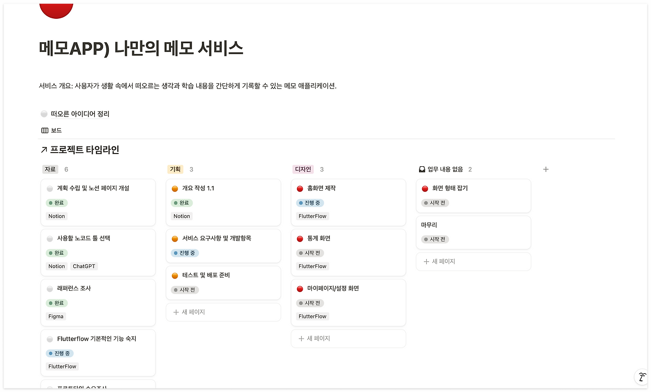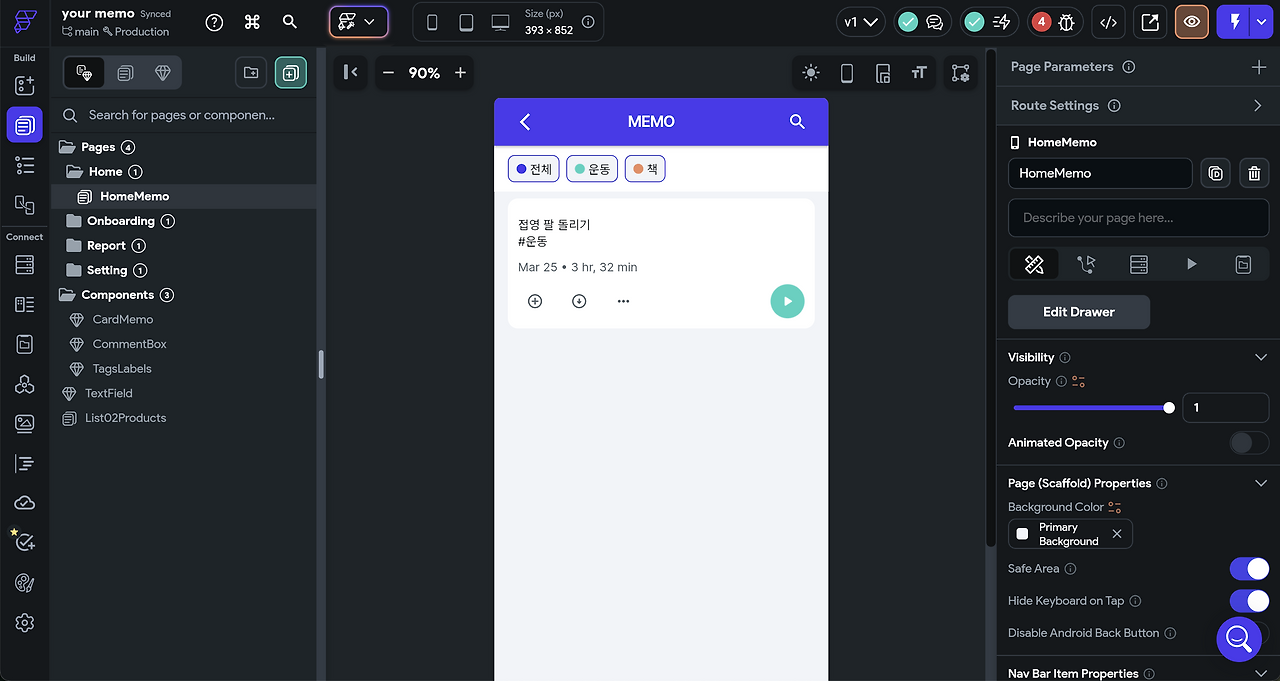 다양한 노코드 툴 중에 사용할 툴은 ChatGPT와 인터넷 서칭 및 Reddit의 여론을 보고 Flutterflow로 선택했다. 4일 동안 유튜브와 공식 문서(docs.flutterflow.io)를 따라 하며 기본적인 기능을 익혔고 5일 동안 홈화면을 제작했다. 홈화면에서는 메모를 작성하고, 수정하고, 정렬하는 기능이 필요했다.