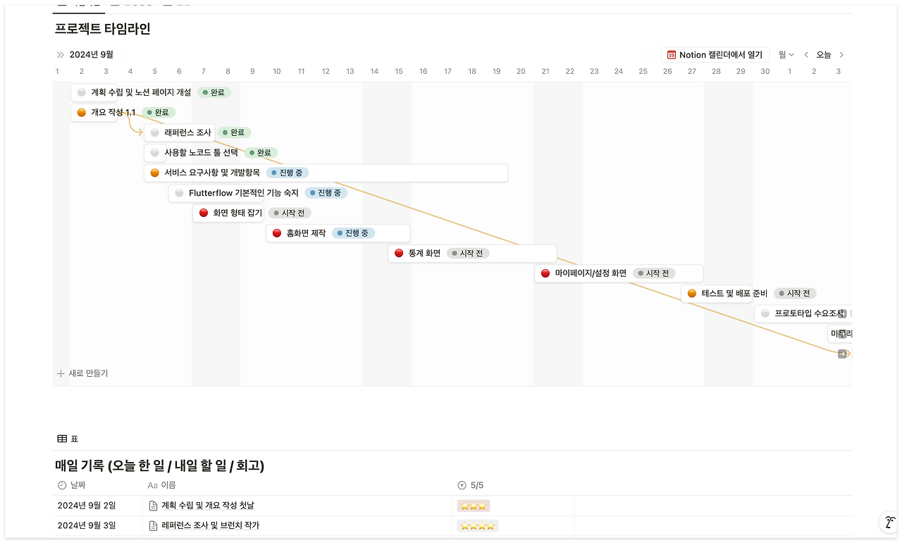 혼자 기획하고 제작하는 과정을 짧게 거치면서도 계속해서 추가하고 싶은 기능이 떠올랐다. 하지만 이런 생각에 빠질수록 먼 산으로 가고 있다는 걸 깨닫고 노션에 "떠오른 아이디어" 페이지를 따로 만들었다. 공상은 쉽고 재밌다. 실현하는 과정은 어렵고 지지부진한 진도에 쉽게 지겨워지기도 한다. 그래서 목표와 계획이 필요하다는 생각을 다시 했다. 목표한 5주라는 기간 동안 완성하려면 이 속도로는 안된다는 생각이 나를 바로 잡았다.