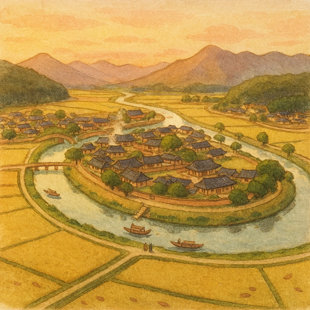 희성은 대답 대신 대청마루 끝으로 걸어 나갔다. 눈앞에 펼쳐진 것은 빌딩 하나 없는 기와지붕과 초가집, 그리고 마을을 감싸고도는 강물이었다.