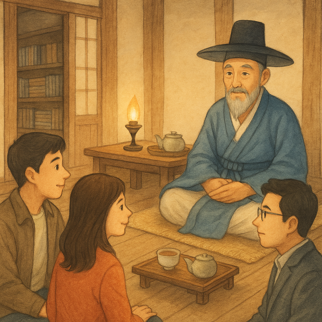 류성룡을 따라 옮긴 사랑방은 [충효당] 대청과는 달리, 외부와 완벽히 차단된 밀실이었다. 류성룡은 맏아들 류담을 제외한 모든 이들을 물렸다. 방 안에는 1591년의 류성룡 부자(父子)와 2025년에서 온 네 사람이 마주하고 있었다. 그들 사이의 유일한 통역가인 다온이 숨 막히는 정적 속에서 류성룡의 입을 기다리고 있었다.