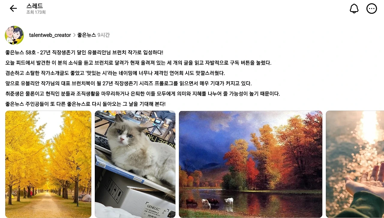 스레드에서 늘 따뜻한 글을 전해주시는 talentweb_creator 님께서 제 브런치 작가 데뷔 소식을 《좋은 뉴스 58호》로 소개해 주셨습니다. 겸손하고 소탈한 글이라 소개해주시고 “좋은 소식은 대차게 알리는 게 정석”이라는 댓글처럼 이렇게 알리고 싶었고 제게 큰 용기와 웃음을 주었습니다.
