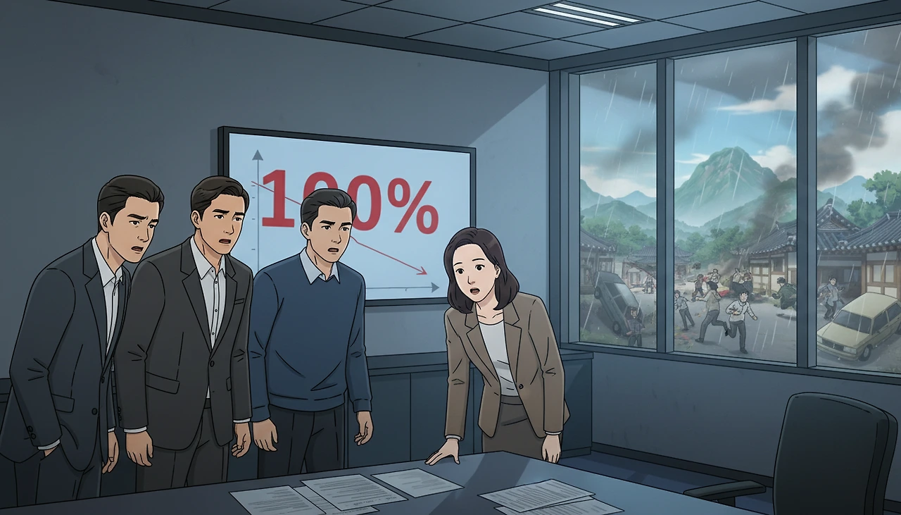 "우린 '배신자'가 됐고, '미치광이'가 됐습니다. 아무도 우리의 말을 듣지 않아요." "아니… 우리가 '실패의 이치'에 졌어요." 희성이 모니터를 바라봤다. 그가 절망한 것은 여론이 아니었다. 94.7% 숫자가 꿈틀거리기 시작했다.