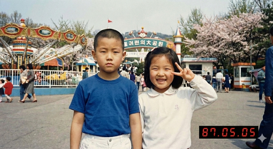 어린이대공원 분수대 앞, 촌스러운 청청 패션을 입은 까까머리 소년과 단발머리 소녀. 소년은 잔뜩 긴장해서 '차렷' 자세로 얼어있고, 소녀는 활짝 웃으며 브이(V)를 그리고 있는 사진.