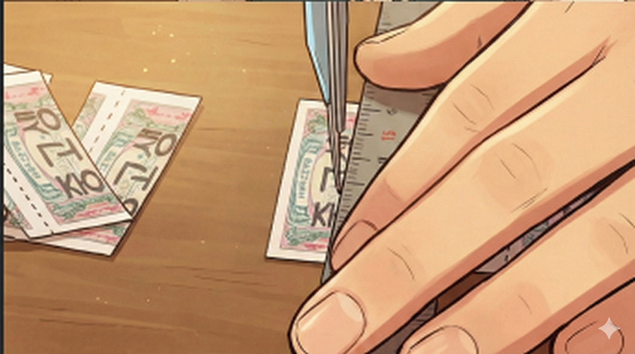 오른손에 들린 커터칼 날은 회수권의 점선보다 아주 미세하게,