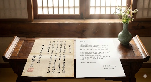 이도가 떨리는 손으로 편지를 받아 들었다. 낯설고 매끄러운 2025년의 종이.