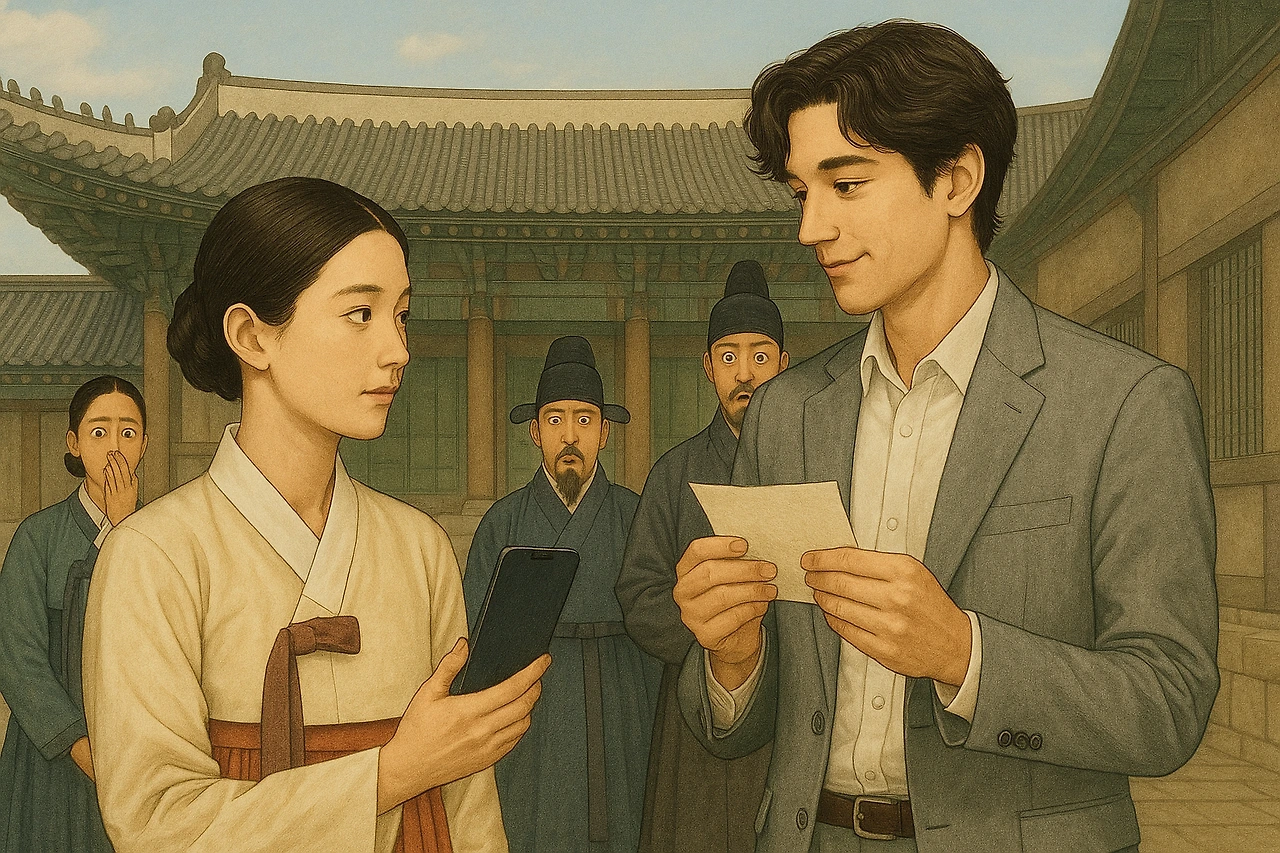 희성은 숨을 삼켰다. 눈앞의 글자는… 한글이었다. 아직 완전한 형태는 아니었지만, 분명한 언문. 믿을 수 없었다. 이것은… 세종대왕이 비밀리에 만들던 바로 그 글자가 아닌가? 그렇다면 지금은… 15세기 조선, 그 한복판이란 말인가? 이 여인의 정체는 대체 무엇인가..충격에 휩싸인 그를 보며, 다온은 다시 한번 붓을 움직였다.
