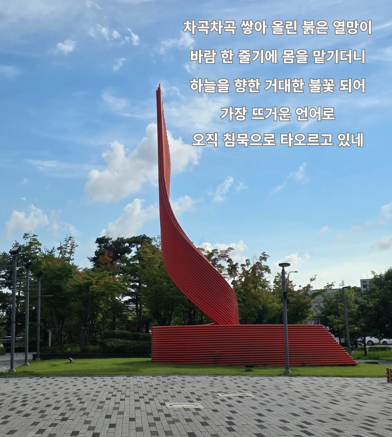 우연히 길에서 마주한 붉은 조형물 앞에서 잠시 발걸음을 멈췄습니다. 그것은 마치 하늘에 닿으려는 간절한 소망이. 하나의 거대한 불꽃으로 타오르는 모습이었습니다. 하지만 그토록 뜨거운 열망은 어떤 소리도 내지 않는 '침묵' 속에 있었습니다.