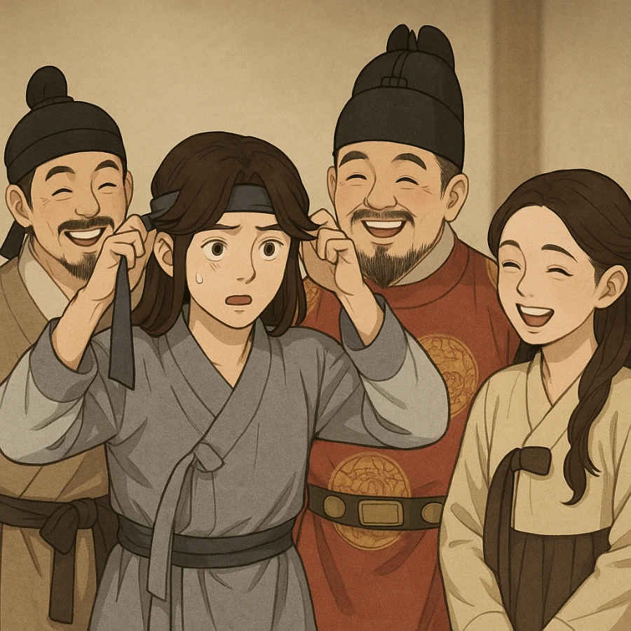 옆에서 다온이 웃음을 삼키며 접어 두었던 보따리를 풀었다. 햇빛을 곱게 머금은 청색 도포, 흰 속저고리, 그리고… 용도를 짐작하기 어려운 기다란 끈 두 줄. 희성은 그 끈을 집어 들며 어리둥절한 표정을 지었다.