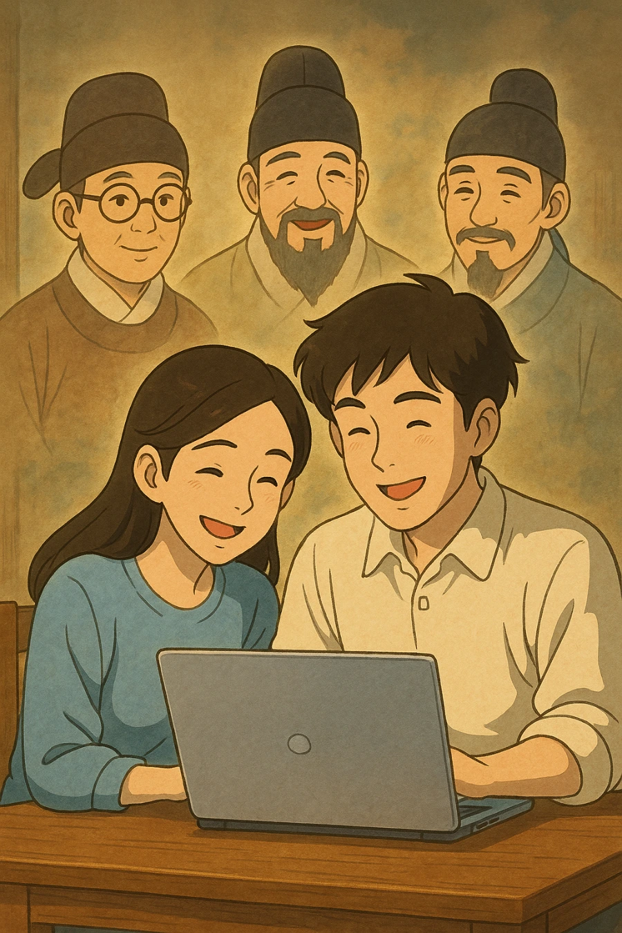 다온과 희성은 서로를 마주 보며 조용히 웃었다. 거실 한쪽, 희성의 노트북 위엔 ‘조선의 바람이 머무는 동안’이라는 제목이 여전히 환하게 반짝이고 있었다. 그리고 장영실, 성삼문, 그리고 세종대왕이 모든 이야기를 흐뭇하게 지켜보고 있다.