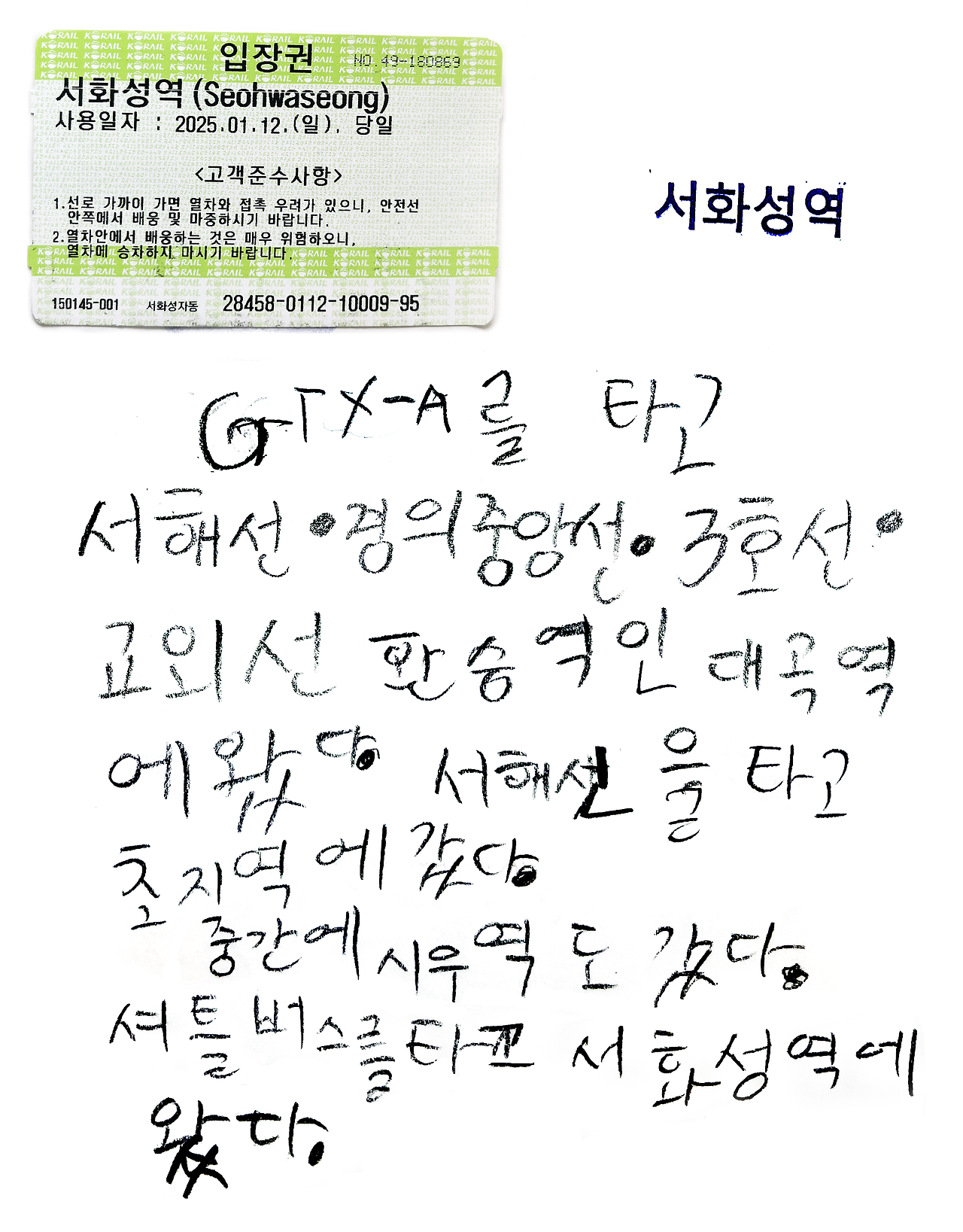 역무원님께서는 기계에서 뽑은 (아래 아들의 일기장에 붙어 있는) 서화성역 입장권을 건네주셨다.