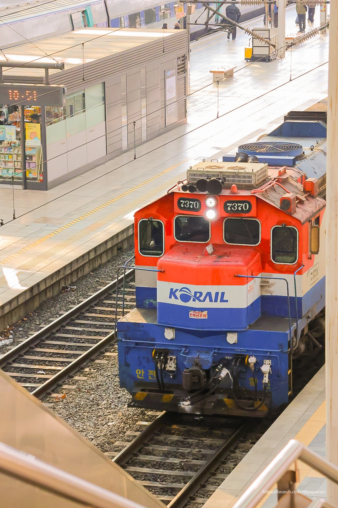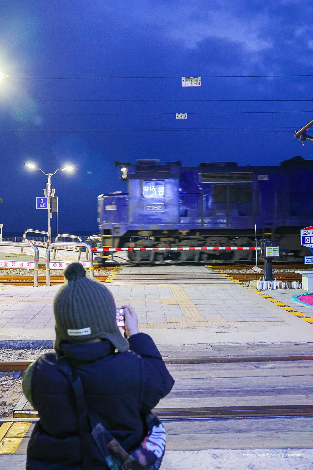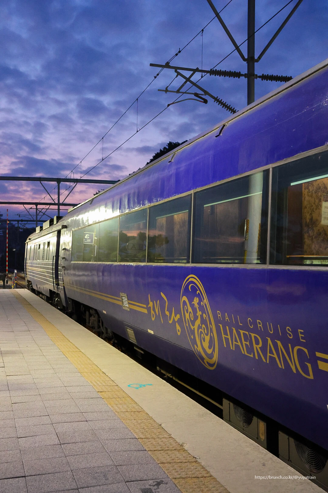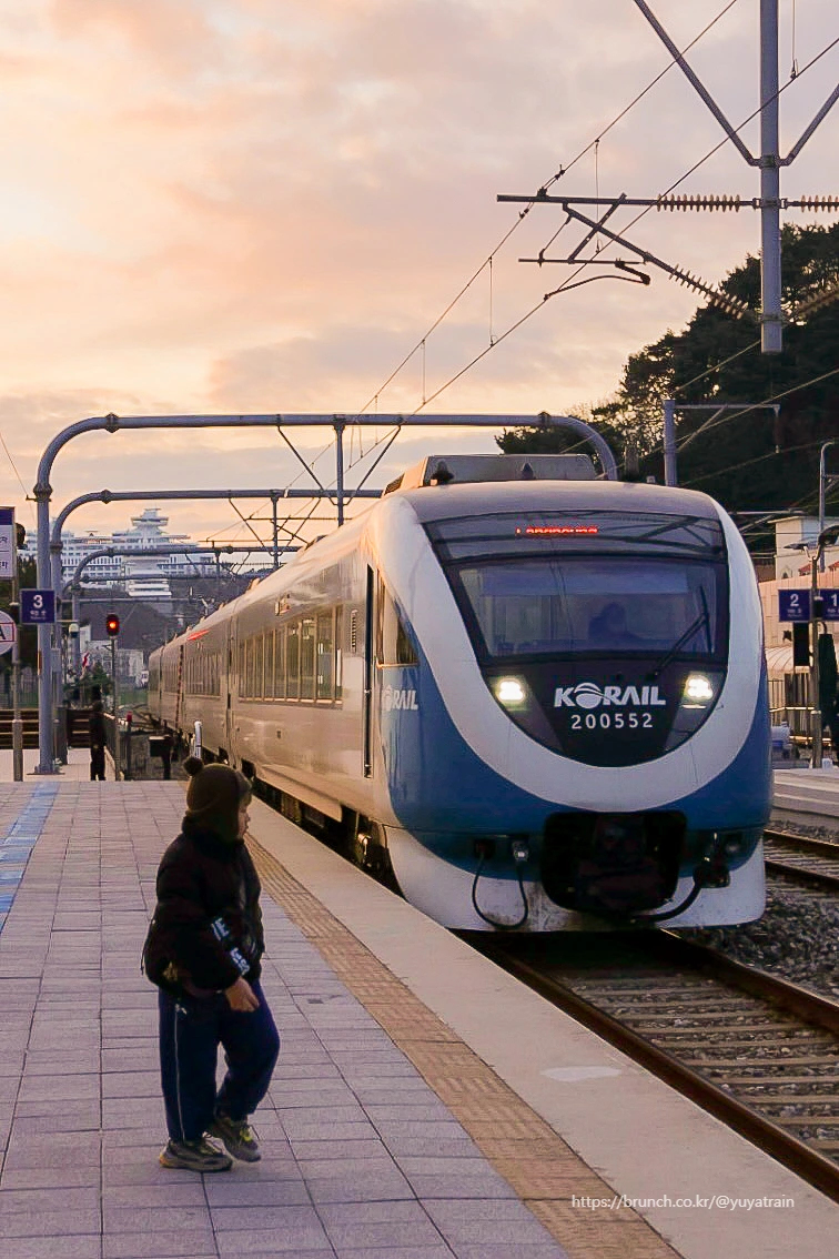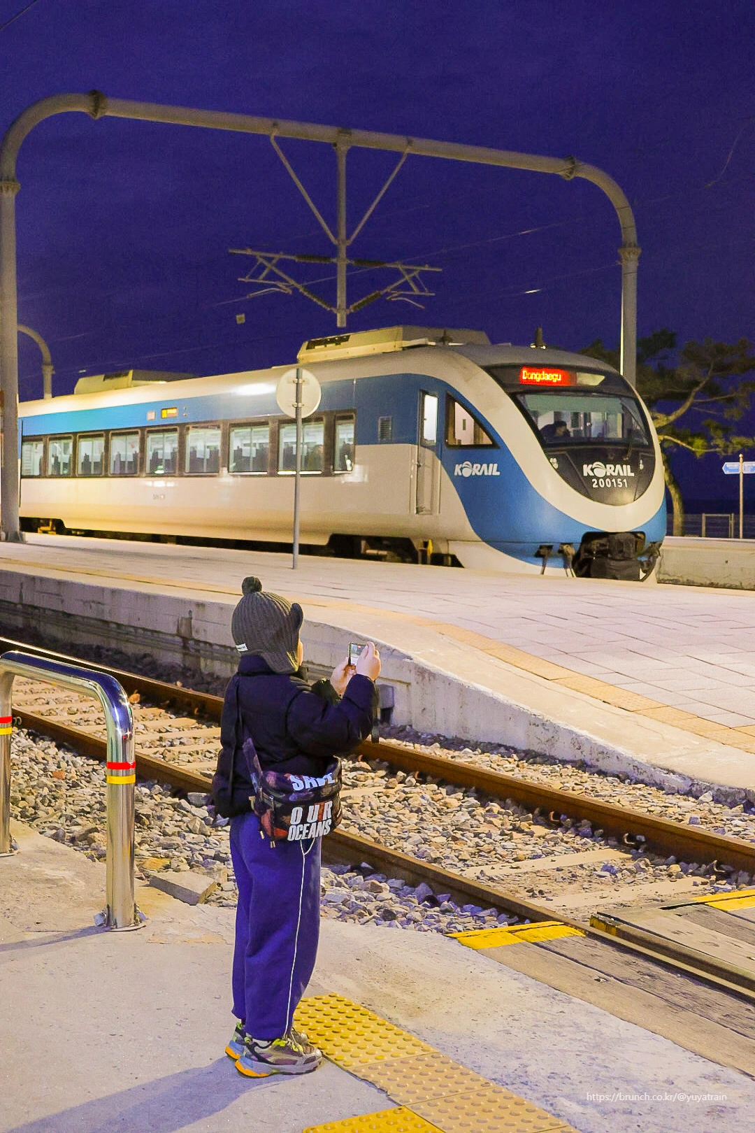 서울 가는 KTX를 8시 25분에 타야 하는데, 정동진 왕복 열차는 마치 일출 시각에 맞춰 짜여 있는 것처럼 완벽하다. 정동진역에 머무를 시간 48분. 역 스탬프를 찍고 나오는데, 저 멀리 새벽 하늘빛을 닮은 열차가 다가온다. '레일 크루즈 해랑', 해랑 열차다!