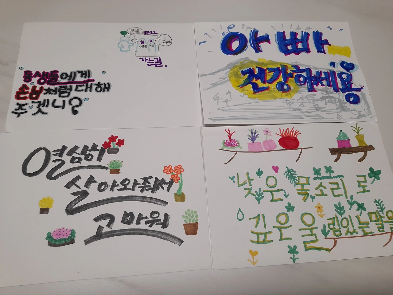활동이 끝나고 4장의 캘리그래피를 한데 모아 사진을 찍었다. 각자의 개성이 드러나는 꾸미기에 다들 서로에게 칭찬을 아끼지 않았다.