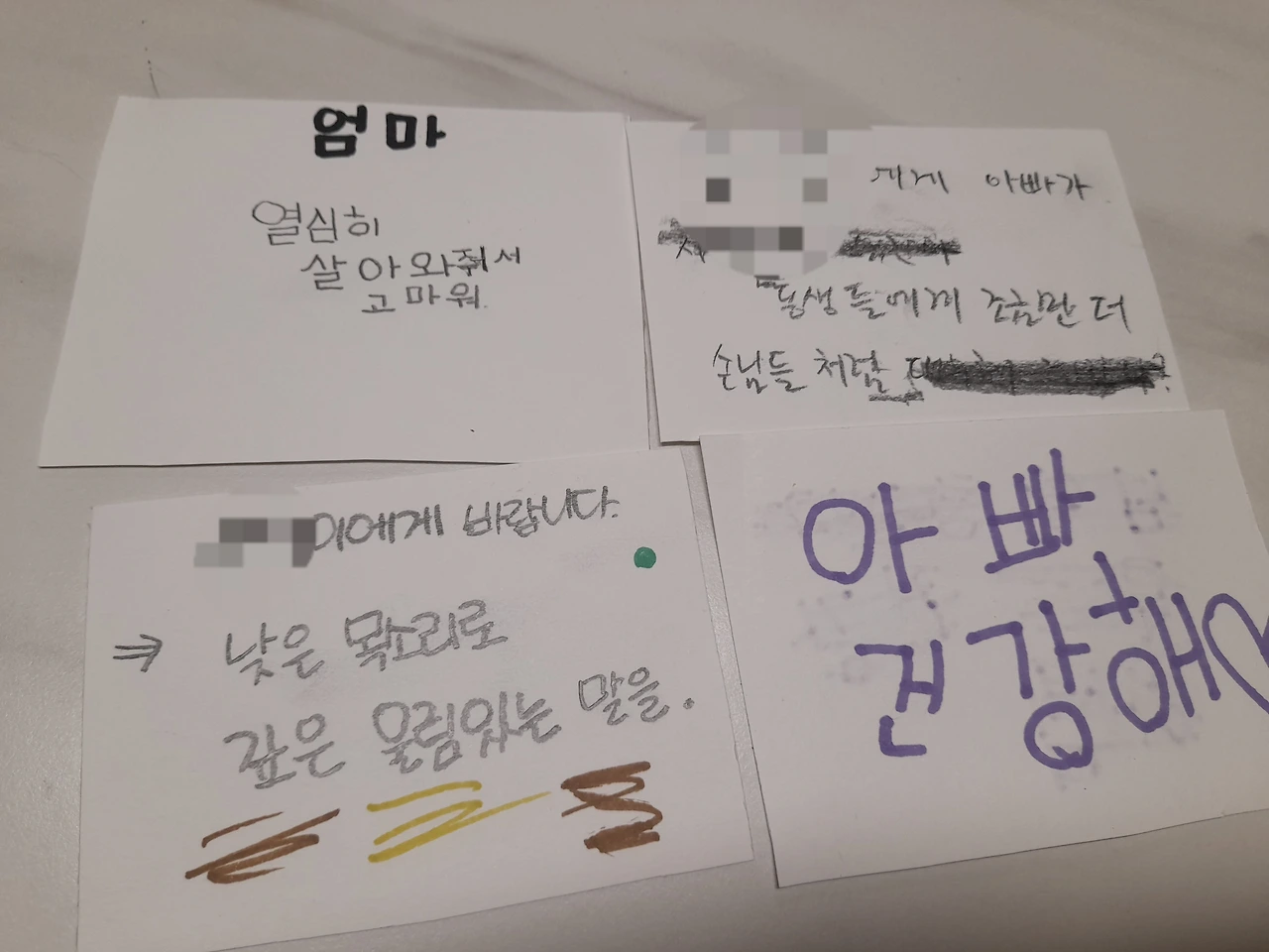 심호흡을 한 번 하고 후다닥 마카펜과 작은 스케치북을 준비한 후, 귀가 후 티브이 앞에 몰려있는 아이들을 불렀다.