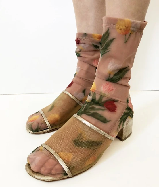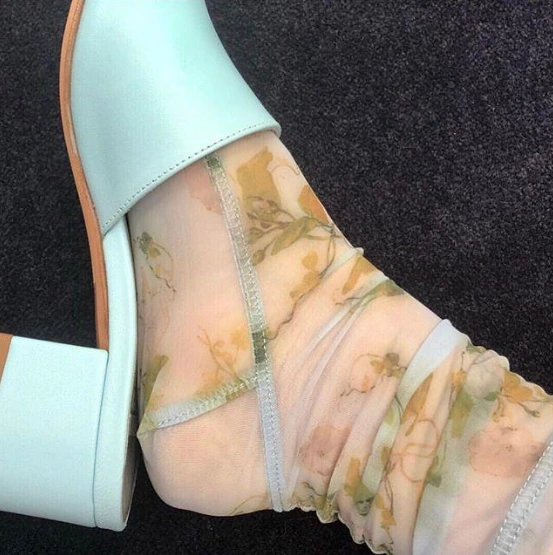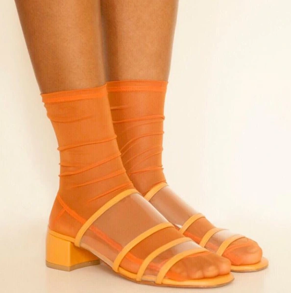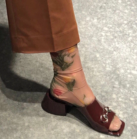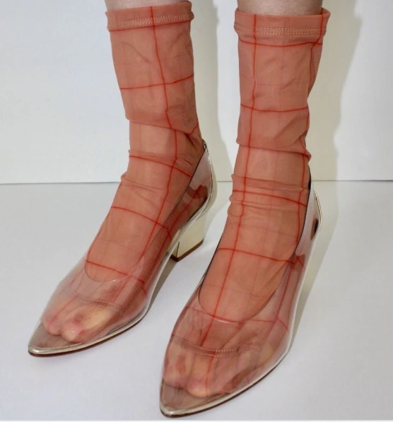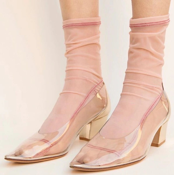 최근엔 PVC 소재가 트렌디한 소재로 떠오르면서 신발에도 많이 볼 수 있는데 비치는 소재 덕분에 삭스 스타일링이 한층 더 즐거워졌다.