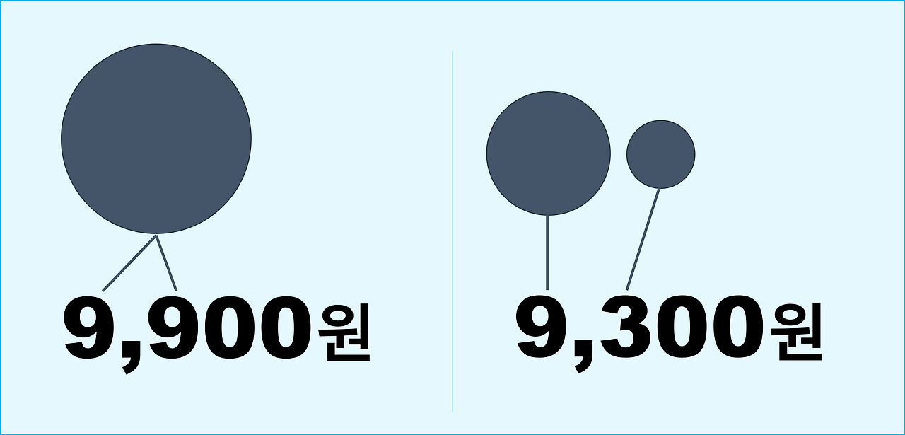 즉 이 공간크기의 차이로 인해 무의식적으로 9,300원은 9,900원과의 실제 차이보다 더 작게 느껴질 수 있습니다. 즉 9,900원은 이렇게 9라는 두개의 의미있는 숫자를 하나의 크기로 그룹화하기 때문에 더 크게 느껴질 수 있는것입니다.