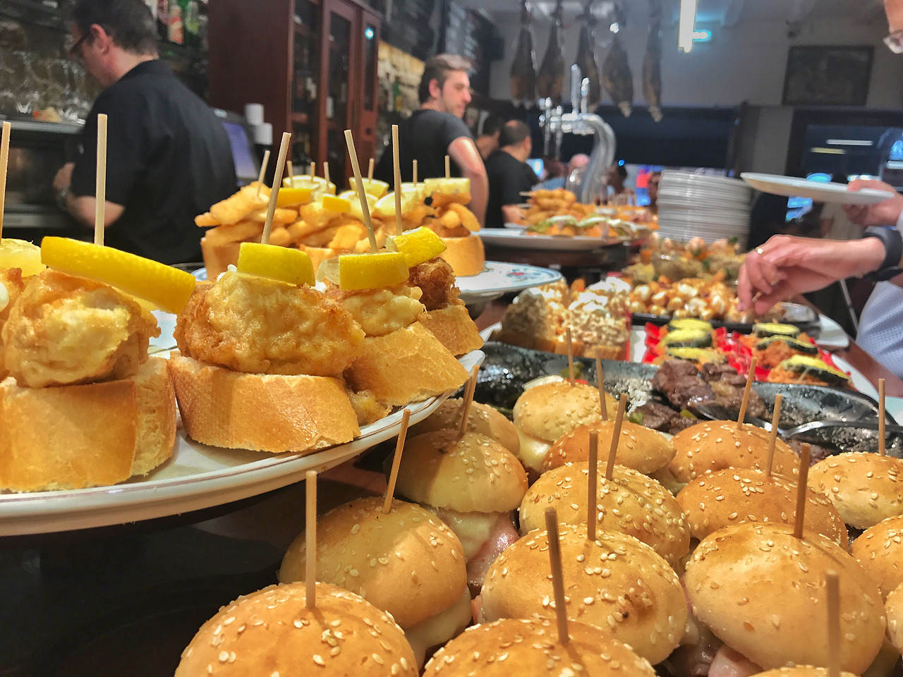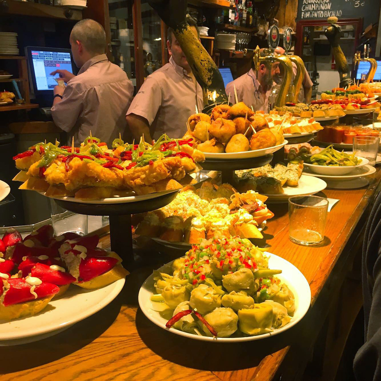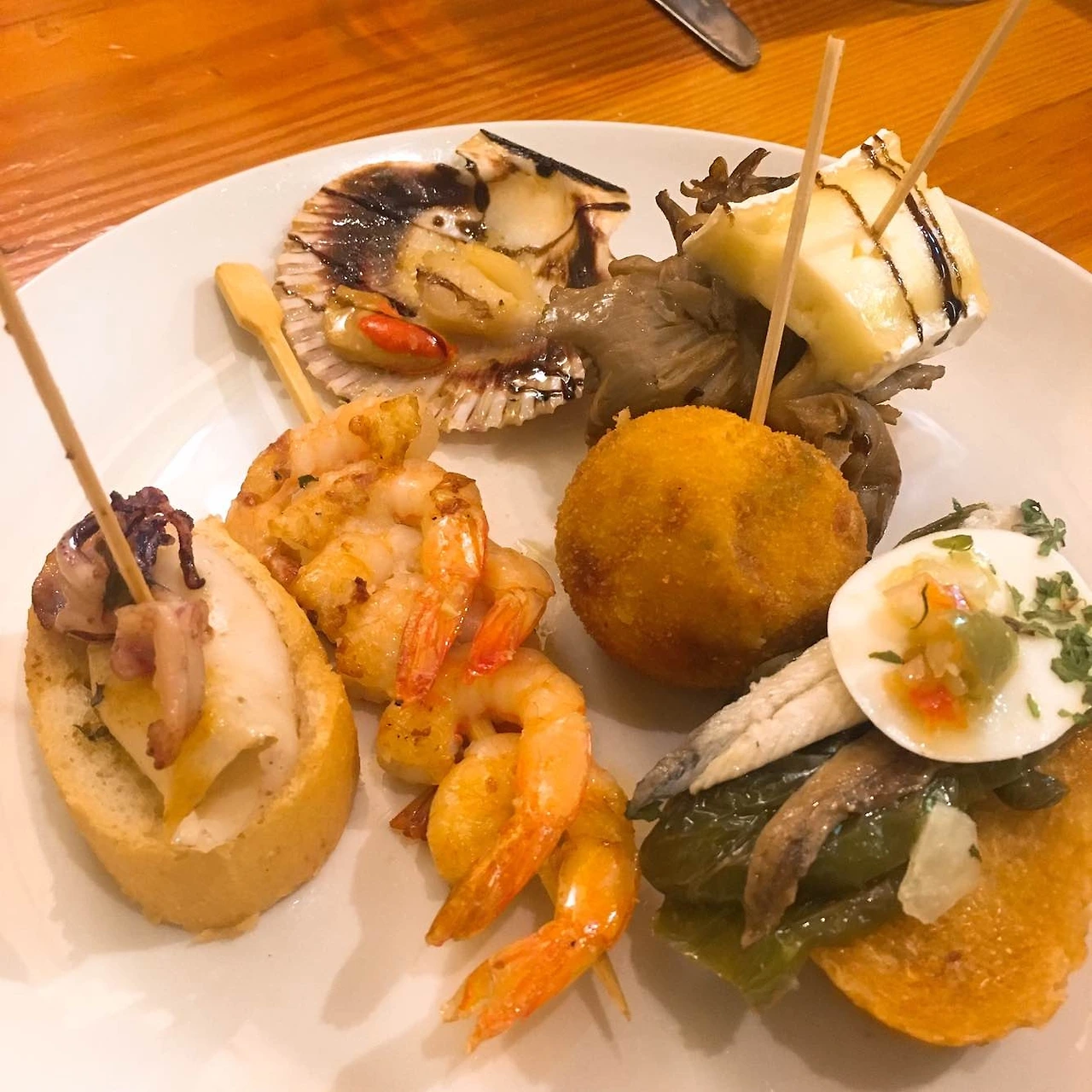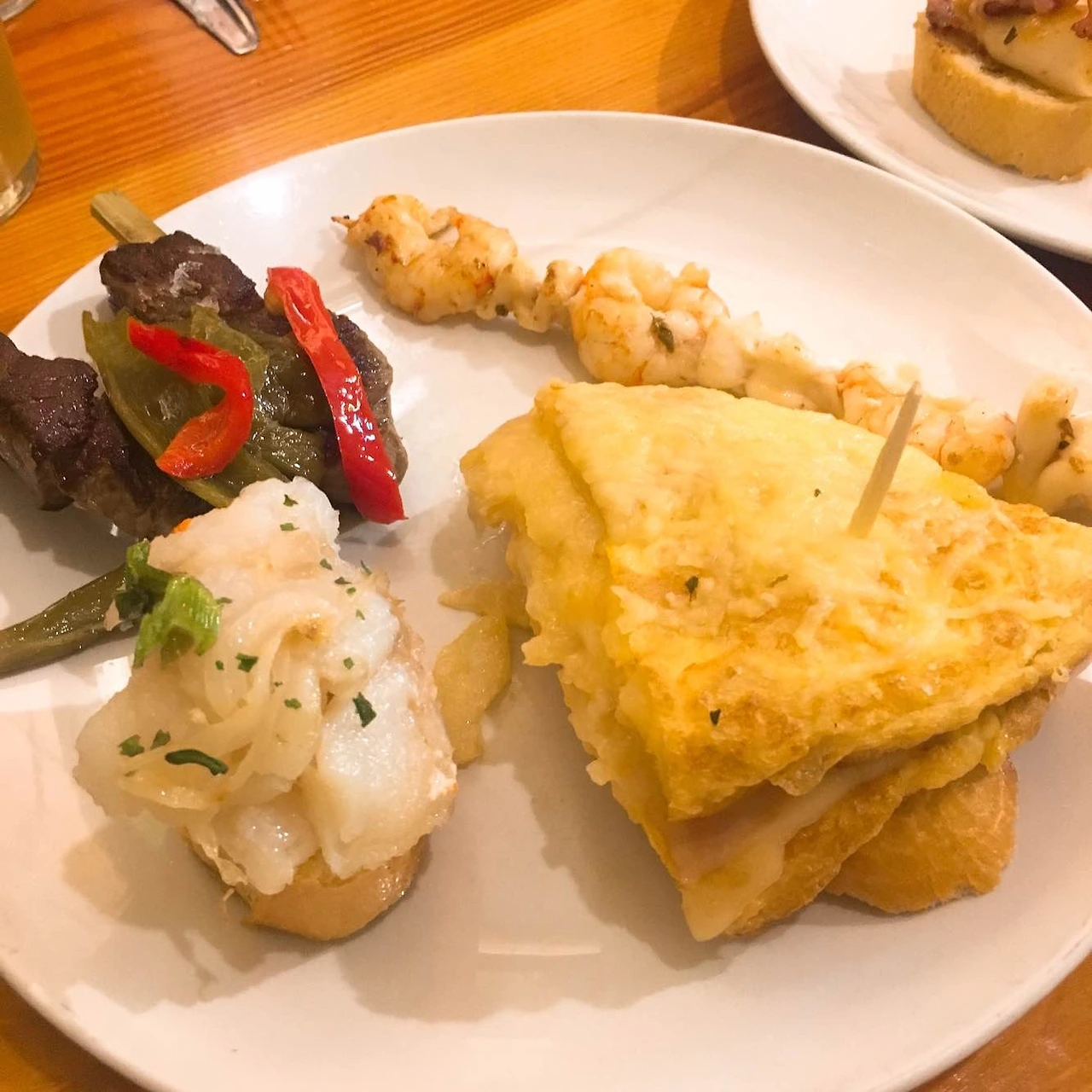 핀초의 성지로 유명한 산 세바스티안 답게 엄청난 종류의 핀초들이 있었다. 기본적인 하몽 샌드위치부터 성게 알 핀초, 새우꼬치까지... 이미 햄버거를 먹어서 그런지 배가 불러서 조금밖에 못 먹었는데, 나중에서야 빌바오의 핀초가 여기보다 못하다는 걸 깨달았다.