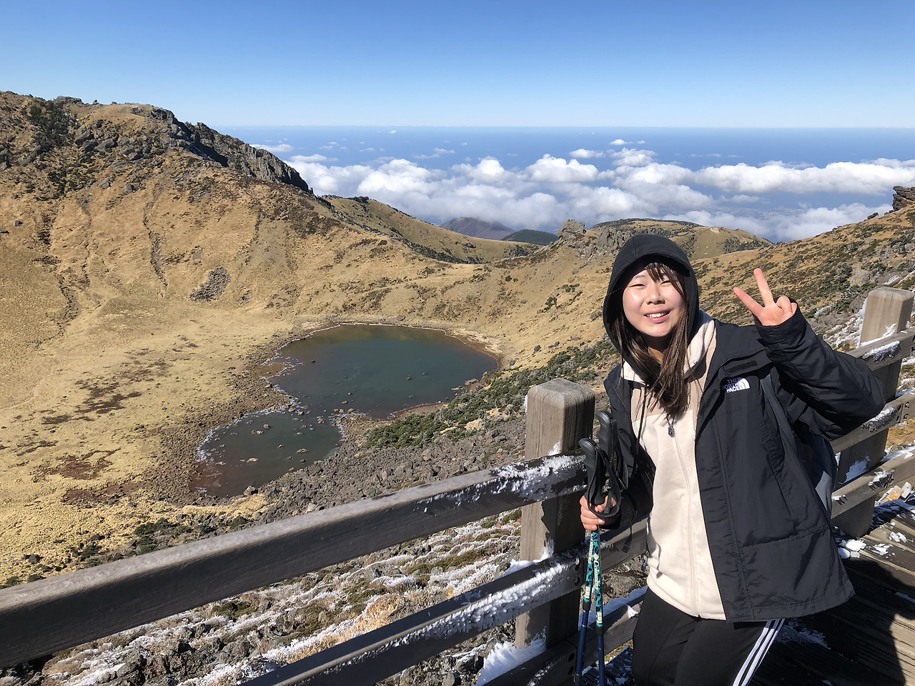 나중에 얘기 들어보니, 3대가 덕을 쌓아야 그렇게 맑은 날씨에 물이 있는 백록담을 볼 수 있다고 한다.