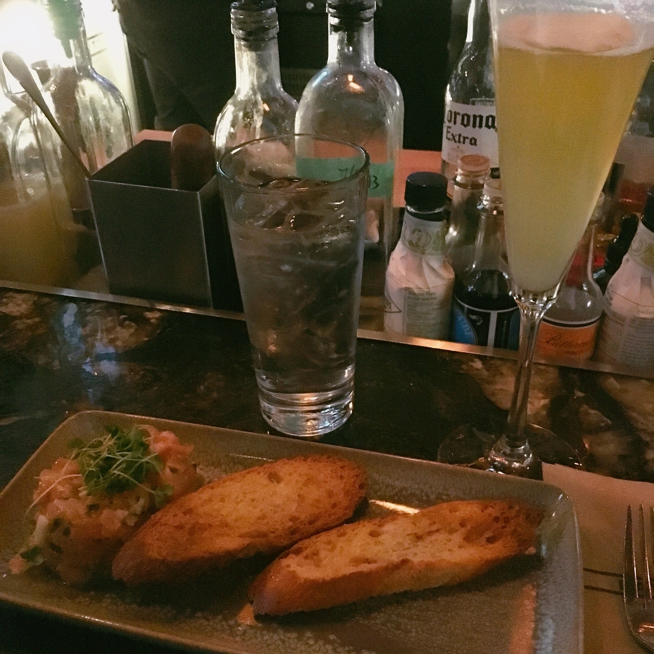 연어 타르타르와 칵테일 한 잔을 시키고 이름 모를 가수의 공연을 보고 있었는데,