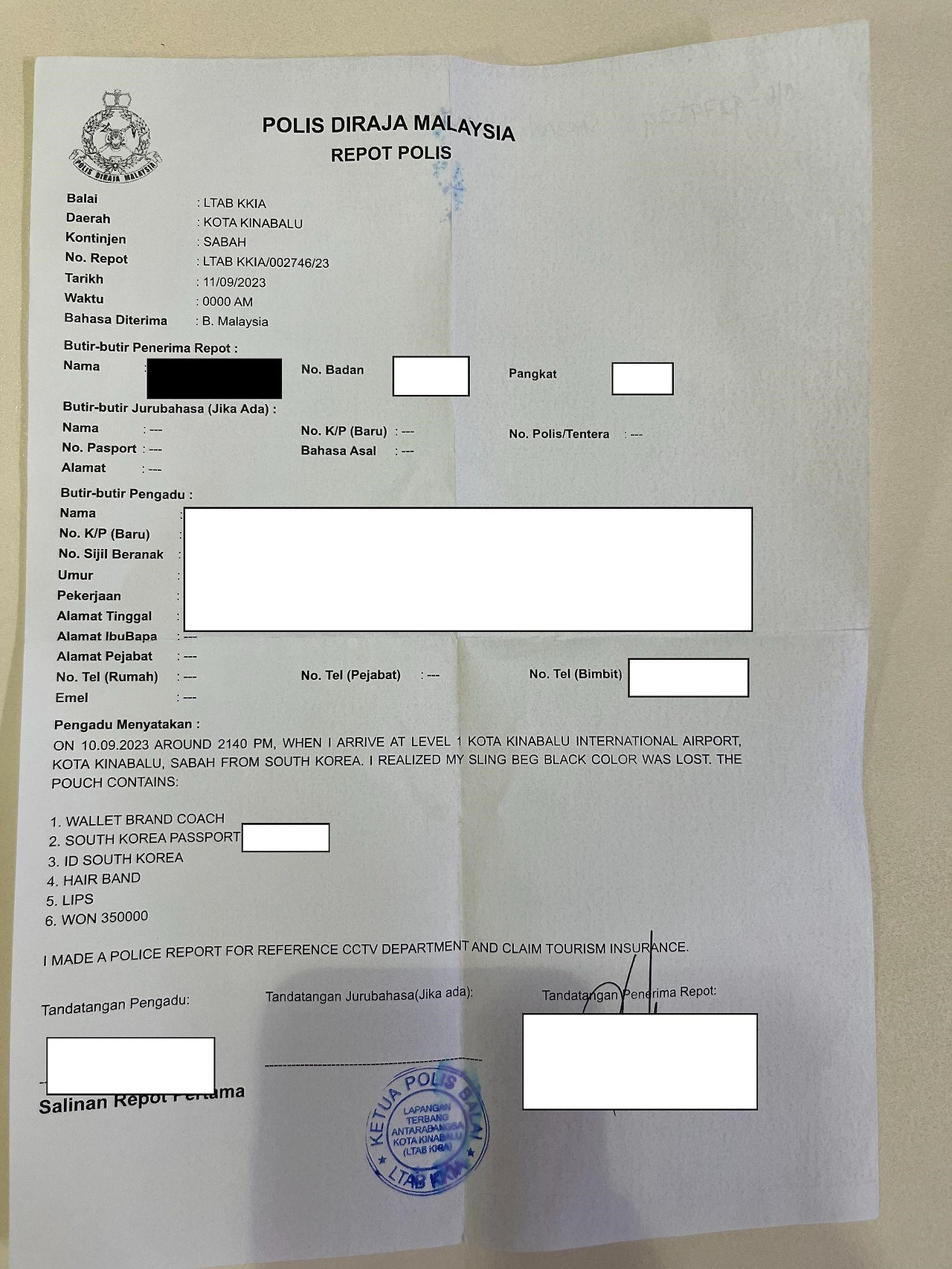 Police Report를 작성해야 CCTV 확인 등도 가능하고, 이후 긴급여권 및 스패셜 패스 발급, 그리고 마지막에 코타키나발루에서 출국할 때 받는 심사시에도 제출해야하기 때문에 꼼꼼하게 작성하시는 것을 추천합니다.(인터뷰 진행하면서, 서류가 잘 작성되고 있는지 계속 확인하는 것이 좋습니다.)