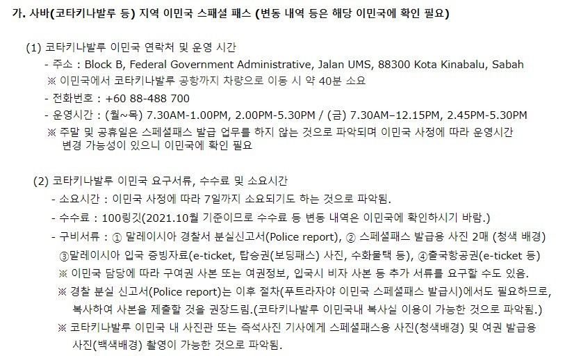 본 가이드라인은 코타키나발루에서 여권을 분실 했을 시, 한국으로 돌아가기 위한 긴급여권과 스패셜 패스 발급 받는 방법을 정리해두었습니다. (기준일: 2023년 9월 12일)