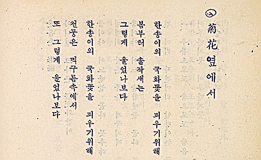 ‘국화 옆에서菊花─_ 서정주’ 1947년〈경향신문〉에 발표된 4연 13행의 자유시로 서정주의 대표작이다. 단 한 송이의 국화가 피어나기까지 1연의 소쩍새, 2연의 천둥, 4연의 무서리로 맺어진 계절 속 자연의 깊은 인연과 기다림을 불교의 인연설을 기반으로 통찰하고 있다.