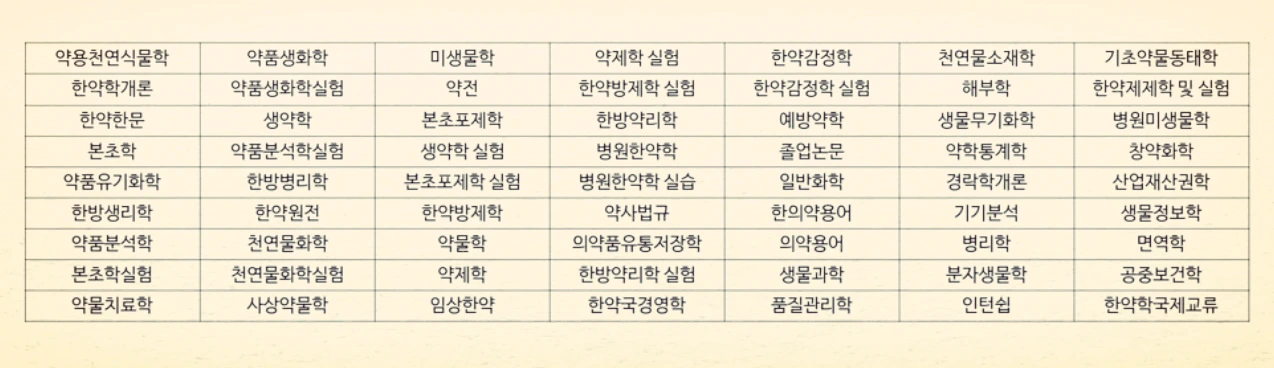 17과목에 달하는 국가고시와 매학기 한 획이라도 틀리면 가차 없이 그어지는 500여개의 한약재명 한자테스트, 매일 밤을 새워 쓰는 실험 레포트, 벌집보다 복잡한 천연물의 화학 구조와 화학식 명을 통으로 암기해야하고 약전, 약사법규 등의 법학 과목까지 마스터해야하는 한약학과의 교과과정을 지내며 전사처럼 쓰러져 나가는 학우들도 종종 발생했는데