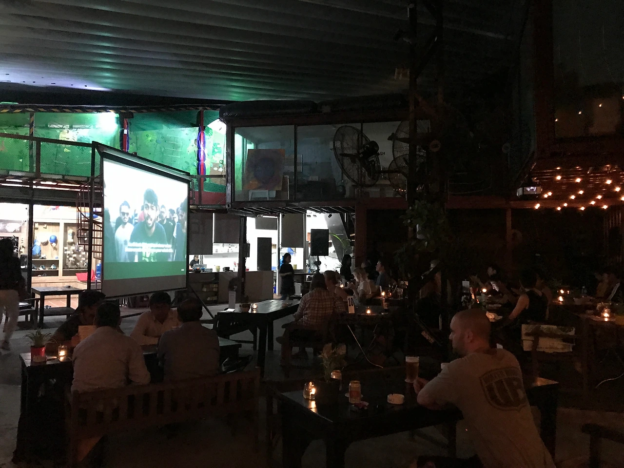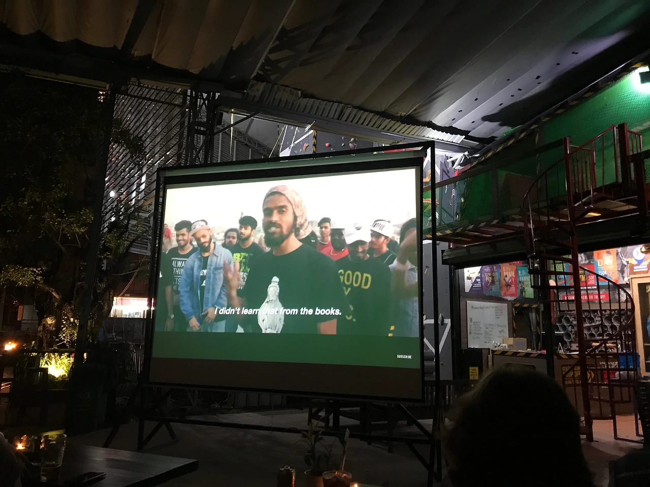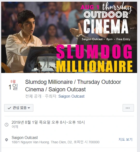 시작시간은 8시였는데, 10분정도 늦게 도착했다. 이미 많은 사람들이 자리를 잡고 있었는데 운이 좋게 테이블 한 자리에 앉을 수 있었다. 대부분 서양 사람들이었고, 일부 베트남 혹은 동양 사람들이 보였다. 사진의 영상은 영화 시작전에 인도의 힙합에 대한 유튜브 영상이었다. 거의 30분이 지나서야 영화는 시작했다. 인도의 슬럼가에서 자란 주인공은 콜센터에서 잔심부름을 하는 짜이 왈라 였는데, 퀴즈를 모두 맞추면 100만루피를 받는 퀴즈쇼에 출연해 우승까지 하는 과정 속에서 자라온 다이나믹한 스토리를 적절히 엮어냈다. 인도 영화라 그런지 밑에 영어 자막도 함께 달렸다. 지금도 인도사람들이 하는 영어는 알아듣기가 정말 힘들다. ㅠㅠ