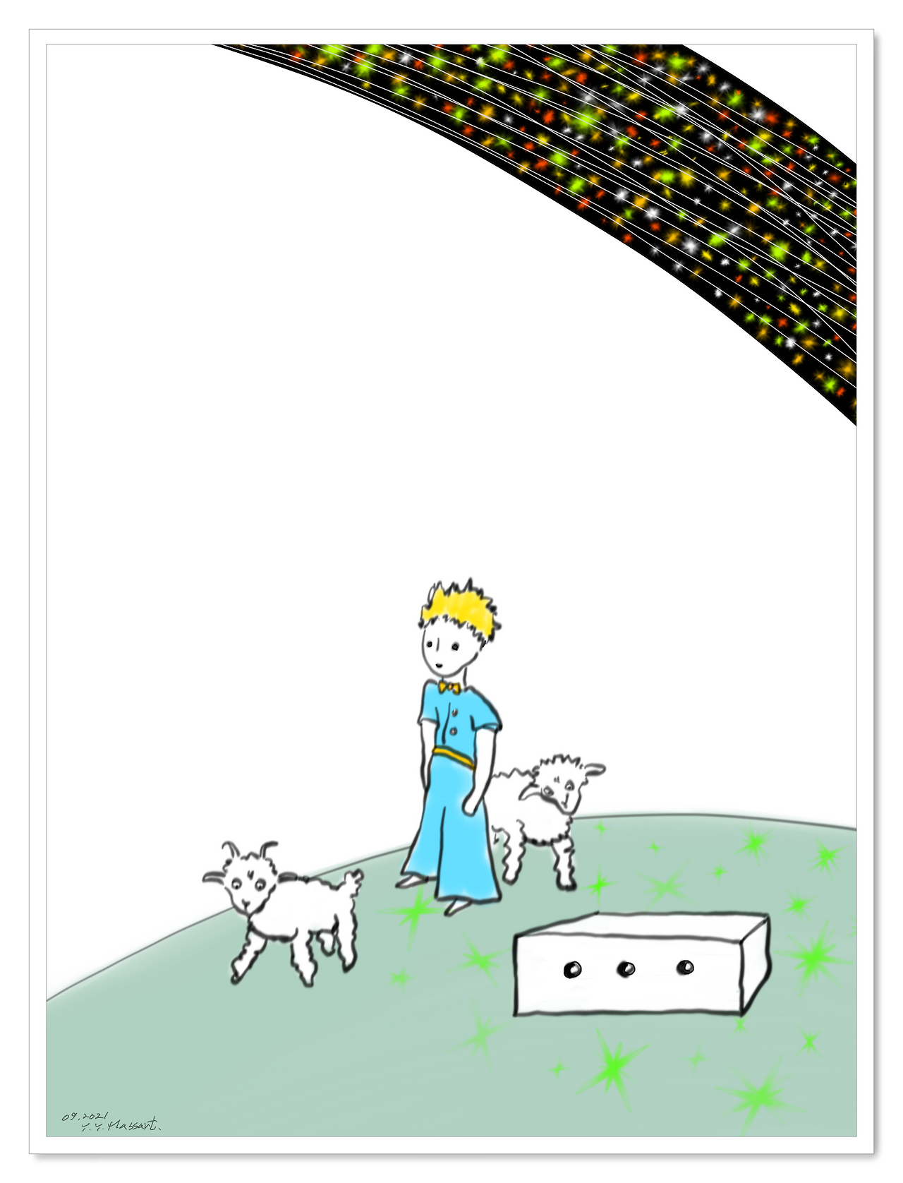 그 누구도 볼 수 없는 양의 모습. 하지만 그 상자 안에 있는 작은 양의 모습을 볼 수 있는 어린 왕자의 마음. 다행히 생텍쥐페리 아저씨는 그 상자 그림으로 어린 왕자의 부탁을 완벽하게 들어줄 수 있었다.