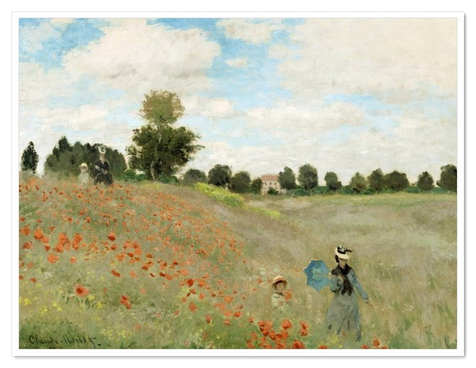 화면 전경에 어린아이와 엄마가 산책을 하고 있다. 아마도 어린아이는 당시 6세였던 화가의 아들일 것이다. 어린 아들은 아름다운 빨간색 꽃을 따며 엄마와 행복한 시간을 보내고 있다. 활짝 핀 개양귀비 꽃의 붉은빛 정서는 자연에 울려 퍼지고 자연도 암울했던 겨울을 잠시나마 잊고 황홀한 봄을 즐기고 있다.