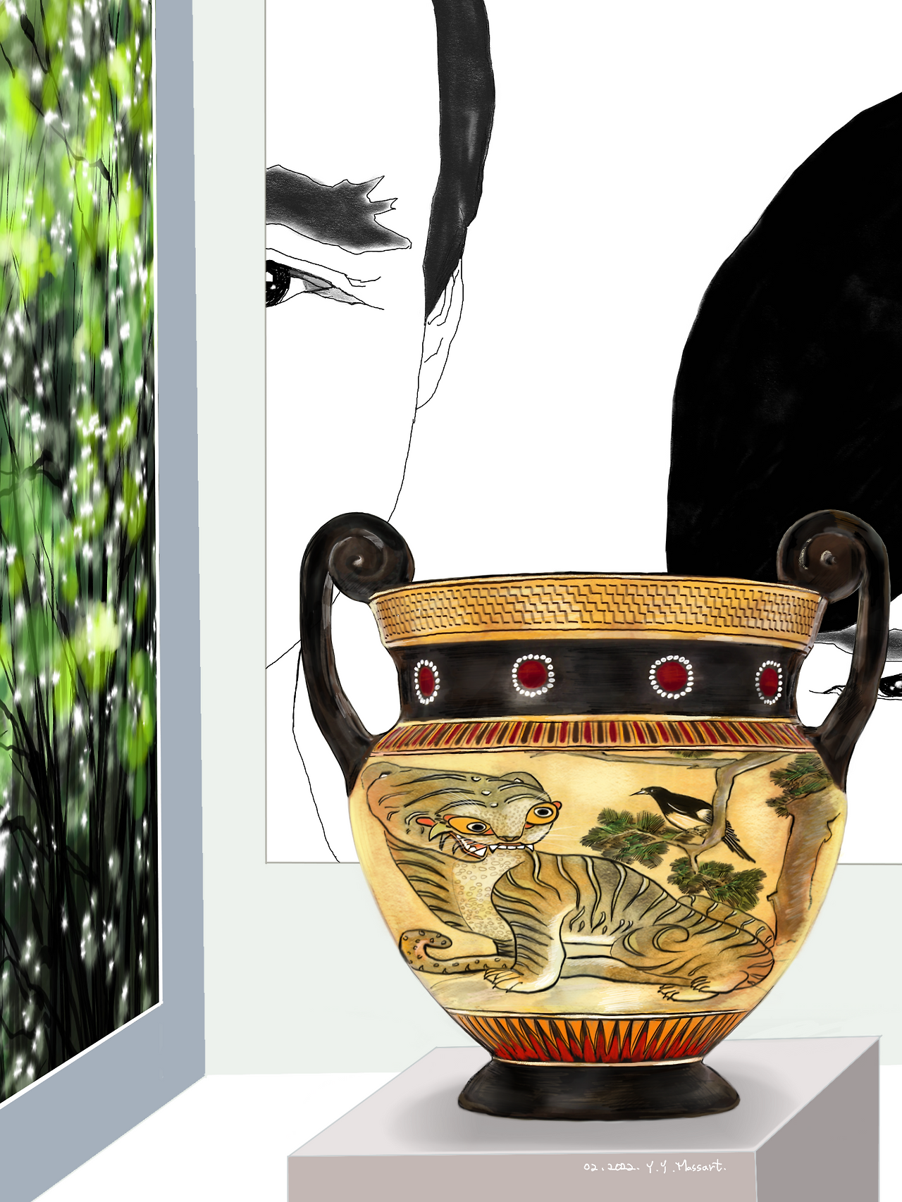 Y. Y. Massart, <민화 속 호랑이가 좋아! 2>, 2022년 2월 (한국 민화와 고대 그리스 도자기에서 영향)