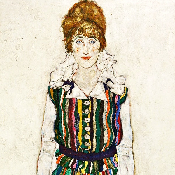 여기 에곤 실레의 아내 에디트 실레를 소개한다. 화가는 1915년 6월 17일에 이 여인과 결혼했다. 그림을 보자. 아내는 흰색 블라우스와 세로 줄무늬 투피스를 입고 남편 앞에 섰다. 갈색 머리도 올렸고 빨간 립스틱도 발랐다. 남편을 응시한 아내는 옅은 미소를 띠고 있다. 행복해 보인다. 남편은 사랑스러운 아내의 모습을 화폭에 담았다.