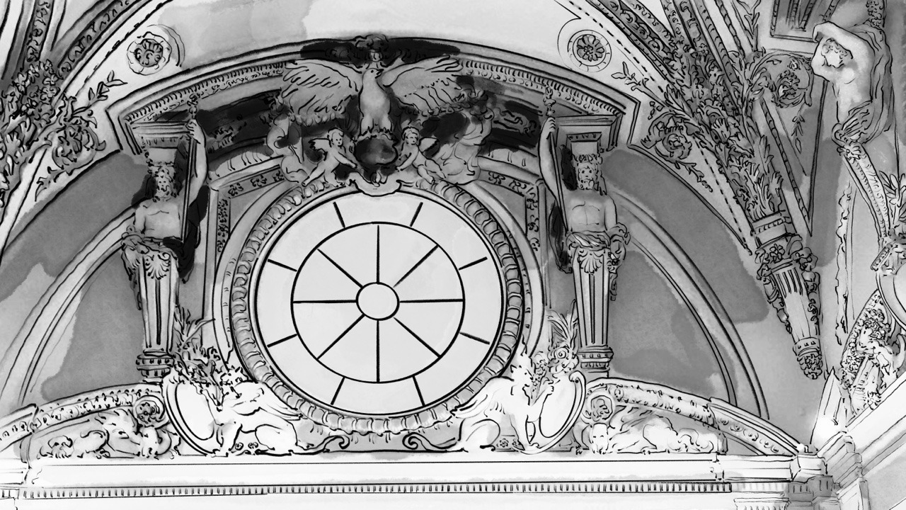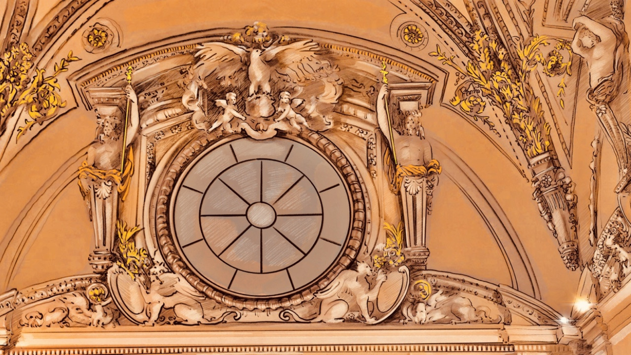 오늘은 당신께 박물관 천장 그림 중 하나를 소개할게요. 당신 혹시 기억나요? 우리가 당신의 조카들과 함께 루브르를 방문한 날, 우리는 박물관 카페 발코니에서 휴식을 취하며 맛있는 크로와상과 커피를 함께 즐겼던 곳이요. 오늘 이 그림은 그 근처의 천장을 그린 것이에요.