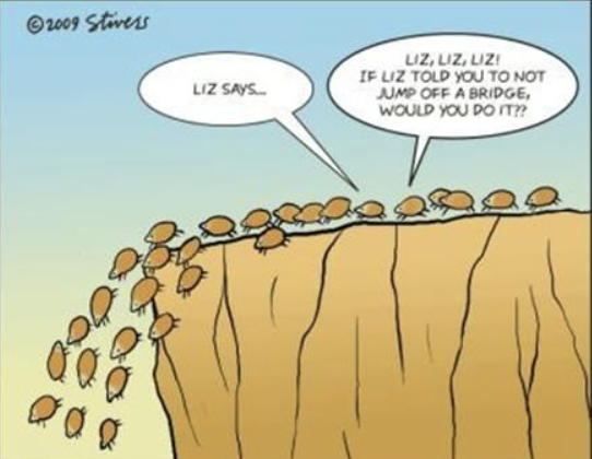 레밍은 직진으로만 움직이며 속도가 매우 빠르기 때문에 한 마리가 어느 방향으로 가면 다른 레밍들도 무조건 따라가게 된다. 결론은 무분별하게 남을 따라하는 행위를 의미한다.