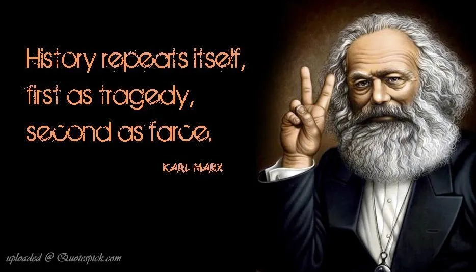 비극과 희극을 주제로 한 말로 더 유명한 것도 있다. 칼 마르크스가 ‘브뤼메르 18일’의 첫 문장으로 꺼낸 말이다. "헤겔은 어디선가 세계사에서 아주 중요한 사건과 인물은 두 번 반복된다고 언급한 적이 있다. 그러나 그는 다음과 같이 덧붙이는 것을 잊었다. 처음은 비극으로 다음은 희극으로 끝난다는 사실 말이다.’