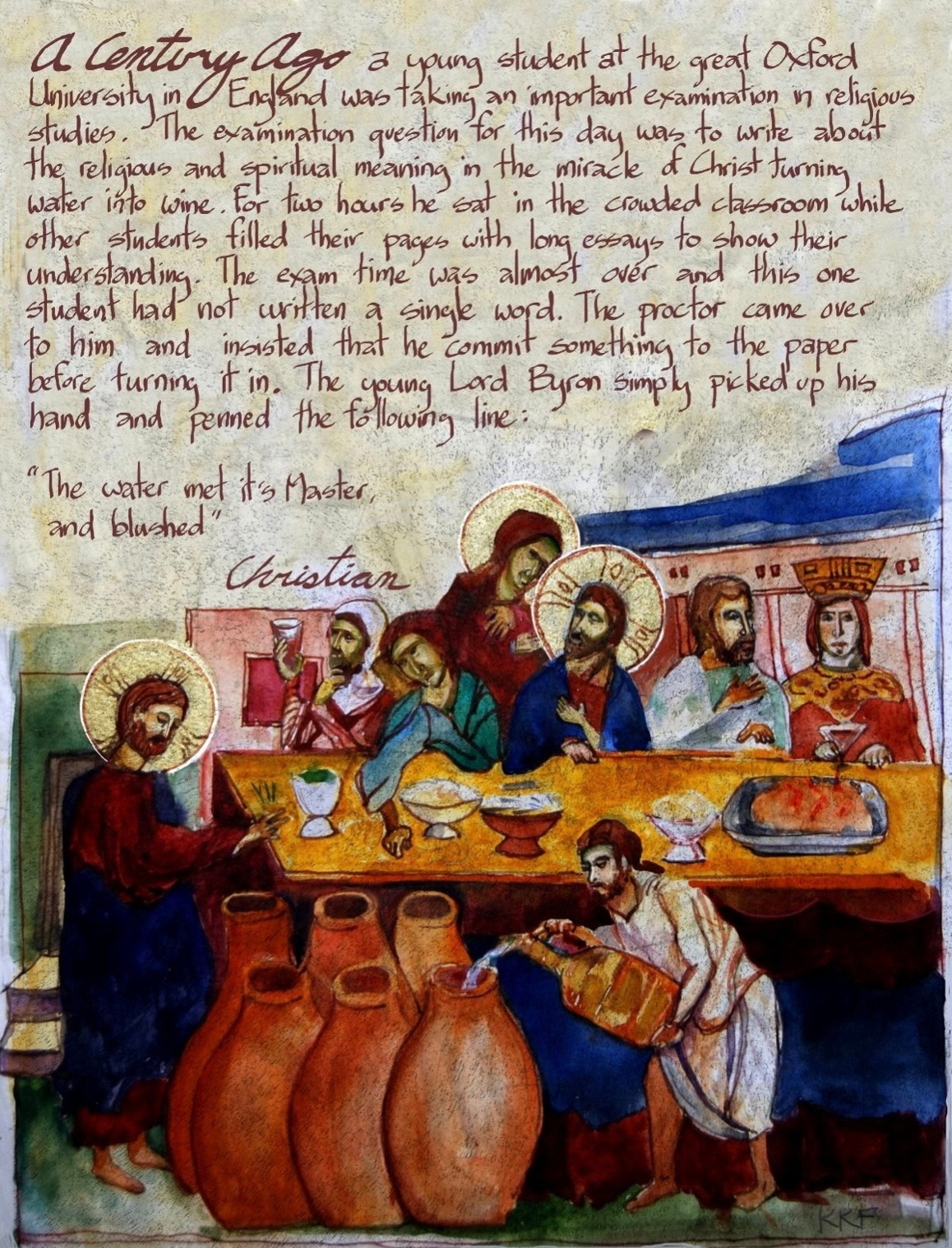 200년 전에 옥스퍼드에서 어느 학생이 종교학 시험을 보고 있었다. ‘예수님이 물을 포도주로 바꾼 기적에는 어떠한 영적인 중요성이 담겨 있는가?’를 기술하는 시험이었다. 학생들은 두 시간 넘게 자신의 생각을 빽빽이 채우고 있었다. 한 학생이 창밖을 바라보며 공상에 잠겨 있었다. 시험이 끝날 무렵에 그를 걱정스럽게 바라보던 교수가 ‘뭐라도 써라! 그렇지 않으면 너는 시험을 통과하지 못한다’라고 말했다. 영국 대학은 한 과목이라도 이수하지 못하면 낙제가 되어 한 학년을 다시 다녀야 하지만, 옥스퍼드는 다시 다닐 기회조차 주지 않고 바로 쫓아낸다. 그러니 교수의 걱정도 이해하지 못할 바가 아니다. 교수의 말에 학생은 펜을 들어 한 문장을 써서 제출했다. 영국의 학교에서 에세이 시험에 만점은 거의 없다. 선생님이 평생 본 최고의 에세이에 한하여 만점을 준다고 하는데, 만점을 받은 그 학생의 한 줄 에세이는 이러했다. ‘물이 주인을 만나 얼굴을 붉혔다(The water met its master and blushed.)’ 그 학생이 바로 위대한 시인 바이런(Lord Byron)이다.
