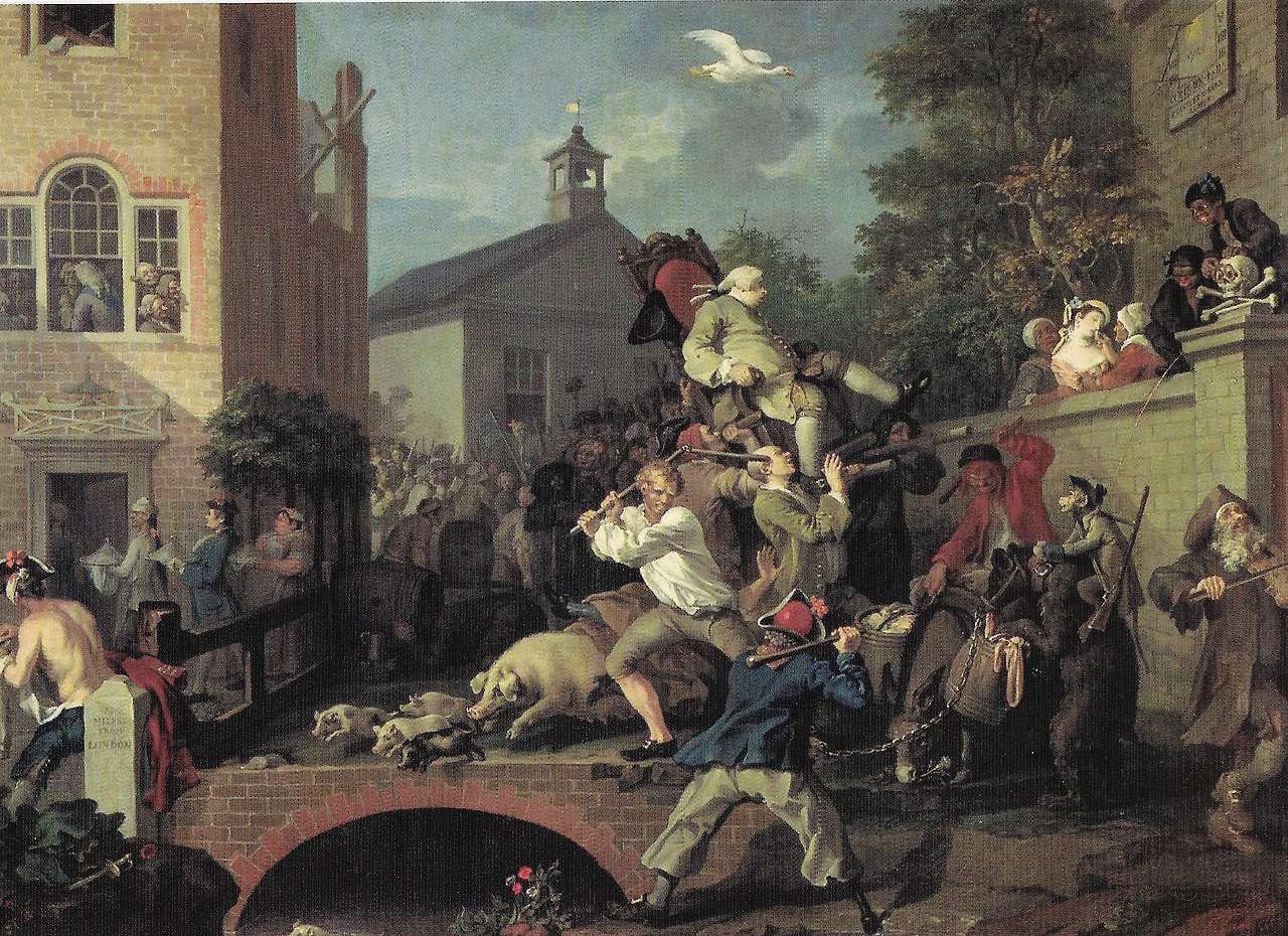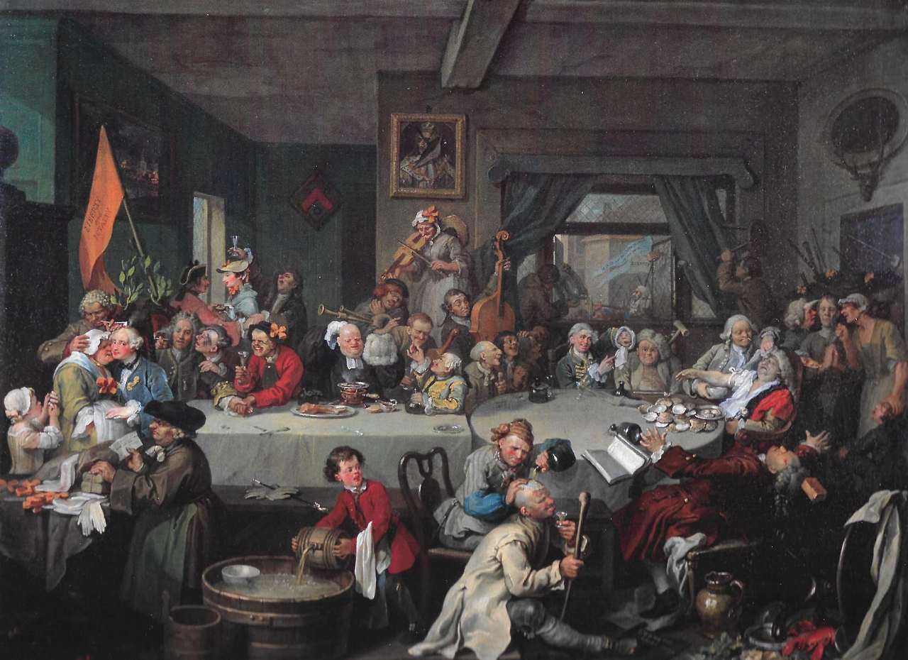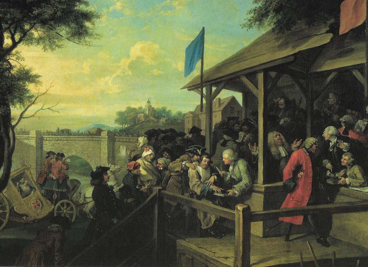 그럴 리 없다. 윌리엄 호가스는 1755년에 ‘선거 향응(An Election Entertainment)’이란 그림을 그렸다. 레오나르드 다빈치의 최후의 만찬을 패러디한 그림으로 휘그당 입후보자 두 명이 유권자에게 향응을 제공하는 장면을 유머러스하게 그렸다. 후보자 중에 하나는 임산부의 배를 만지면서 밀담을 나누고 있고, 다른 하나는 술주정뱅이 옆에서 곤혹스러워하고 있다. 시장(mayor)은 술에 취해 곯아떨어졌고, 선거 관리 위원은 토리 당원이 던진 벽돌에 맞아 실신해 있다. 길거리에는 반유대주의 깃발이 휘날리고 있다.