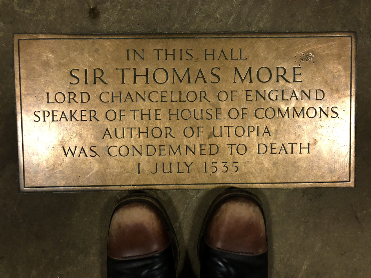 여왕이 누워있는 바로 밑바닥에 동으로 된 표식이 몇 개 보이죠? 그중에 한 곳에 쓰여 있는 것이 유토피아를 쓴 토마스 모어가 사형 언도를 받은 장소라는 표식입니다.