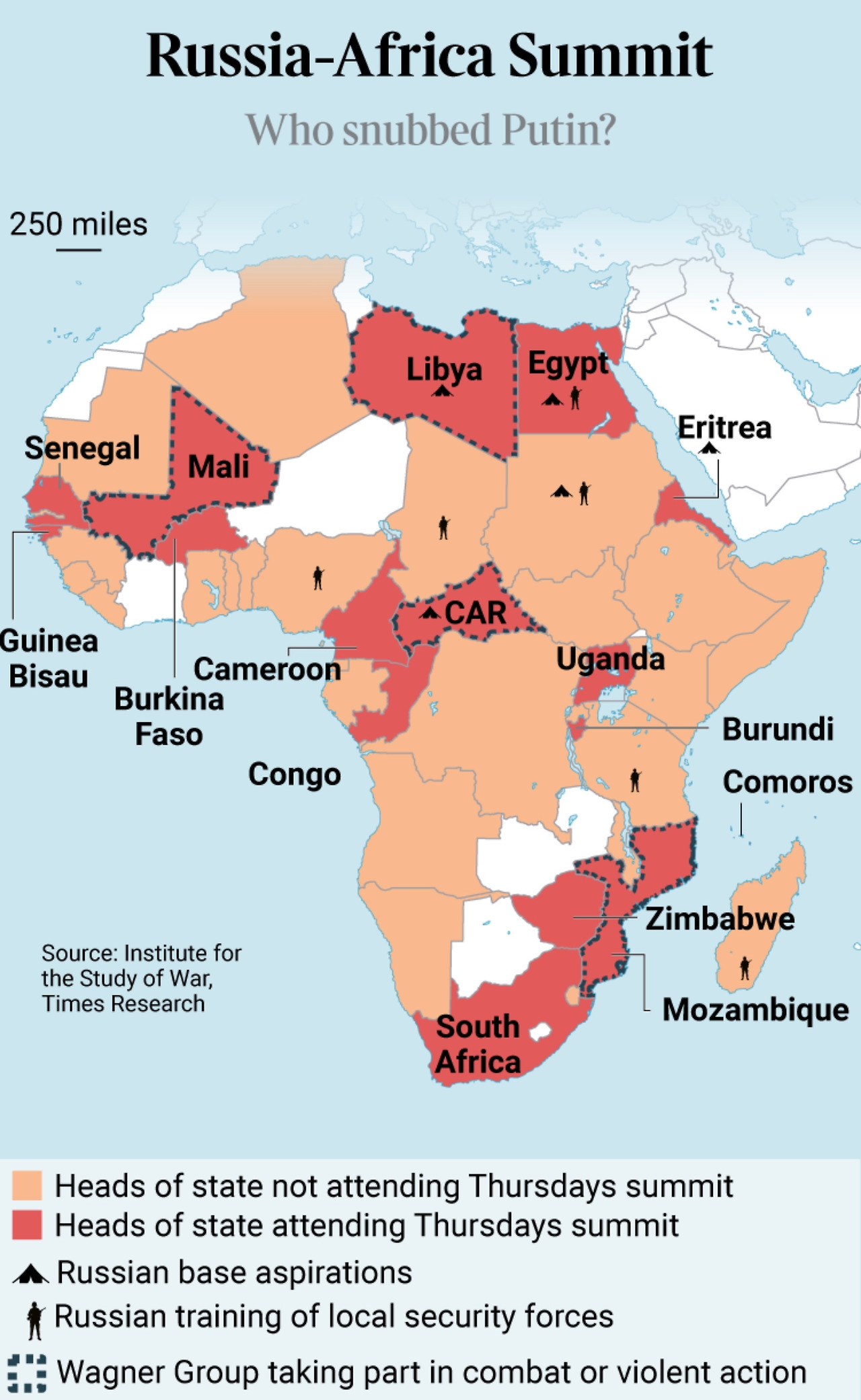 전쟁이 시작되고 러시아의 국제적 고립은 상상을 초월하는 정도가 되었어요. 그래서 이번 러시아-아프리카 서밋이 중요했어요. 그런데 오직 17개국만이 참여했어요. 러시아의 푸틴 입장에서는 대참사죠.
