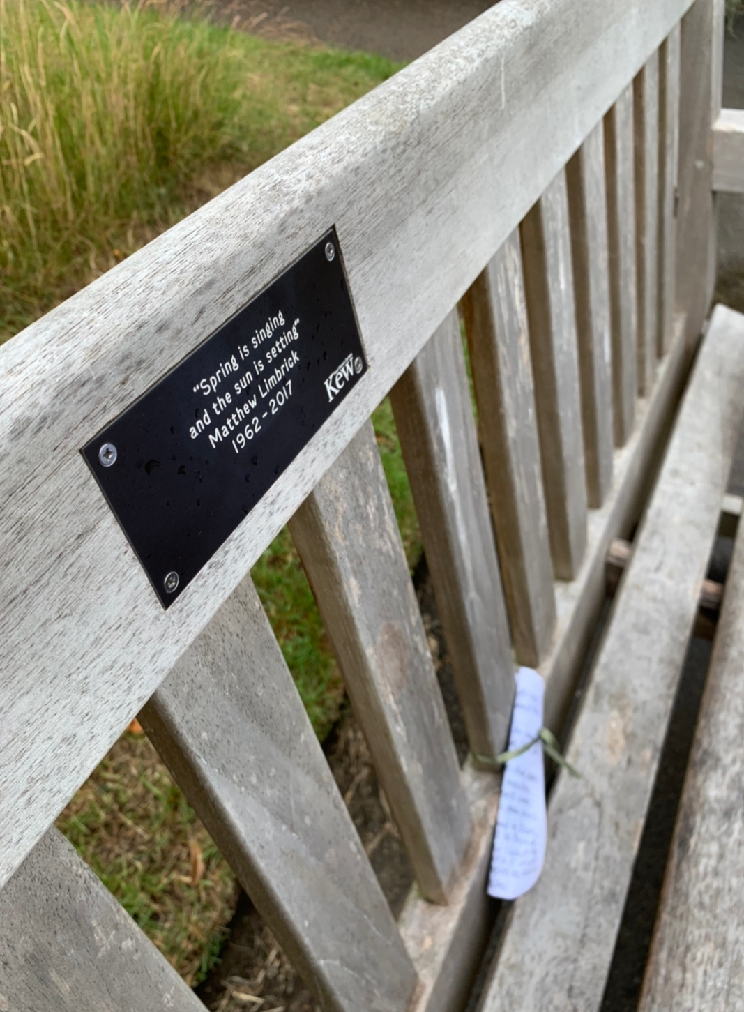 큐 가든이 커다란 나무 밑에는 벤치가 있는데, 영국 공원에 있는 대부분의 벤치처럼, 이곳 벤치에도 어김없이 누군가를 기리는 표시가 되어 있다. 어느 벤치에는 정성 들여 작성한 편지가 매달려 있었다. 이 편지는 정성상 왠지 어디든지 전달될 것만 같았다.