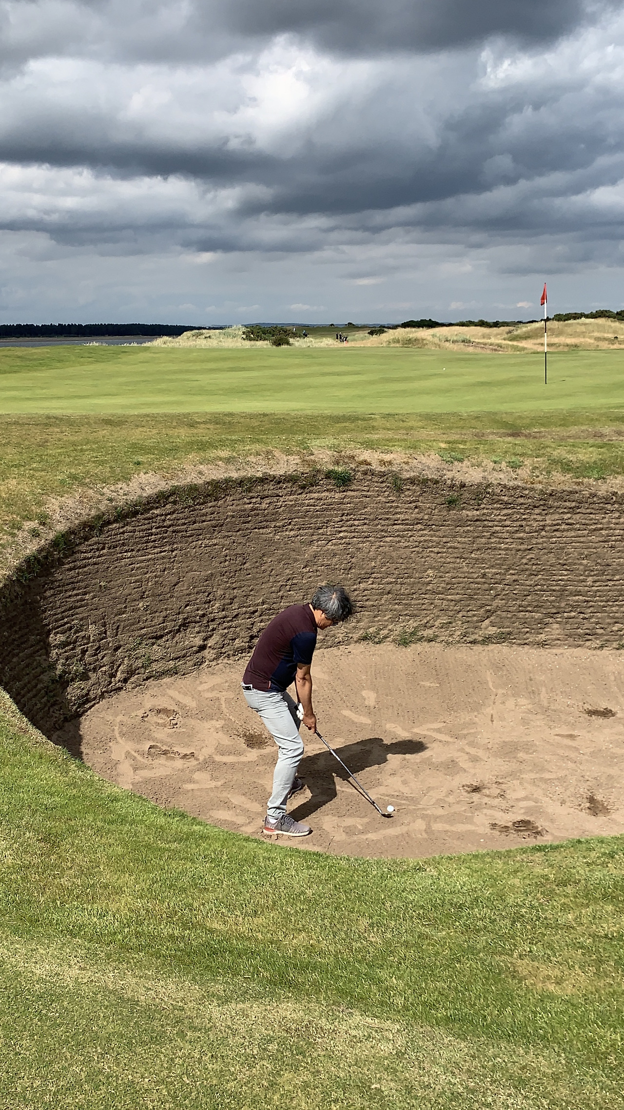 -. 벙커를 깊이 파서 항아리 벙커를 만든 이유는 강한 바다 바람이 벙커 모래를 쓸어 가기 때문에 수직으로 깊게 파지 않으면 유지가 안된다. 항아리처럼 만들어도 모래가 금방 없어져 채워 넣어야 한다. 벙커와 모래는 자연 그대로라서 생각처럼 멋지거나 낭만적이지 않다. 벙커 턱에 걸리면 3타, 4타 만에 나오는 것이 보통이다. 한해에 US 오픈, US 아마추어 오픈, 브리티시 오픈, 브리티시 아마추어 오픈을 모두 석권한 전무후무한 기록의 소유자 바비 존스가 11번 홀 벙커샷을 네번 만에 탈출하고 기분 나빠서 집에 가버린 적도 있다. 공교롭게 나도 그 벙커에 빠졌는데, 네번 만에 벙커에서 탈출했다. 같은 실력이다. 링크스 코스에서 벙커는 벌타라고 생각하면 된다.