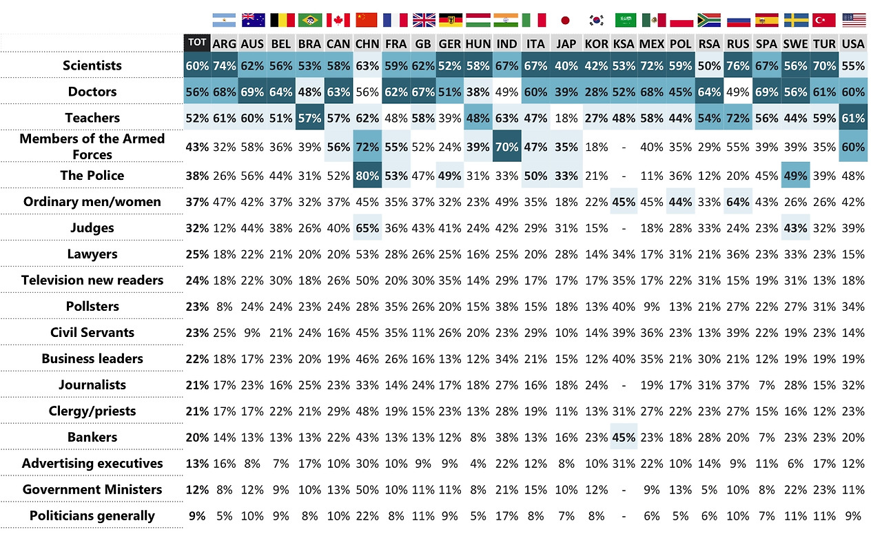 2019년 입소스(IPSOS) 신뢰도 조사를 보면 재미나다. 영국은 성직자를 신뢰한다는 대답이 15%, 한국은 13%다. 신앙인 수가 반등하는 것이 영국이나 한국이나 모두 쉬워 보이지 않는다.